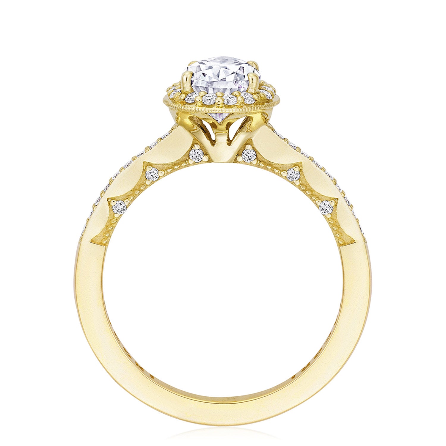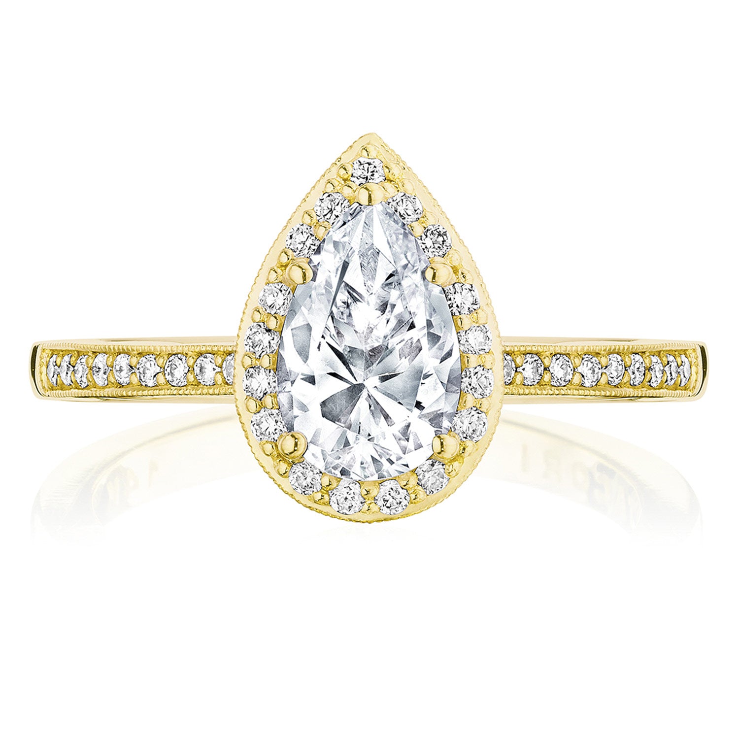 A pear shaped diamond solitaire is brought to life by a crown of diamonds and rests gently on a diamond band. This ring features the Coastal Crescent inner face with pinpoint diamond details for a truly regal look.