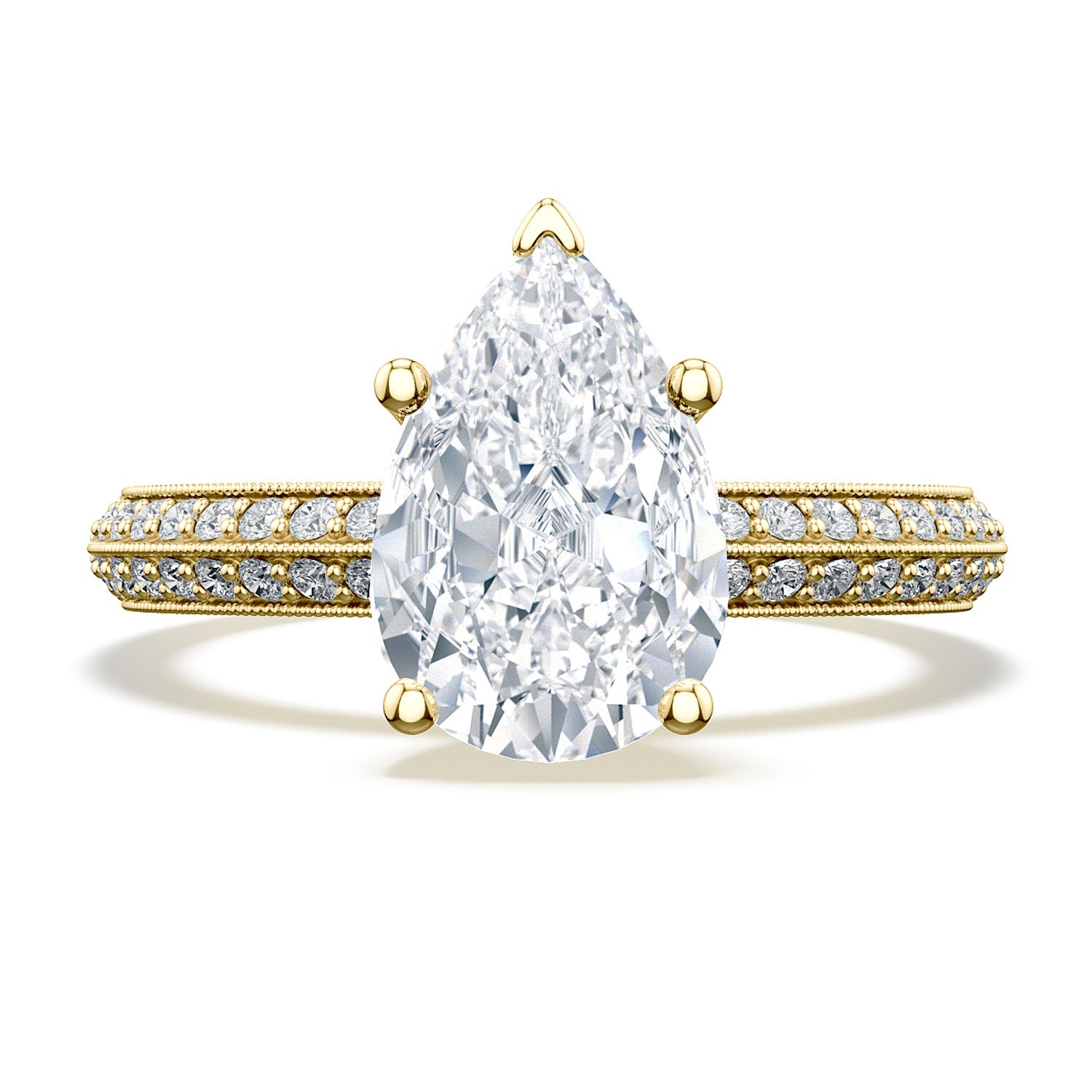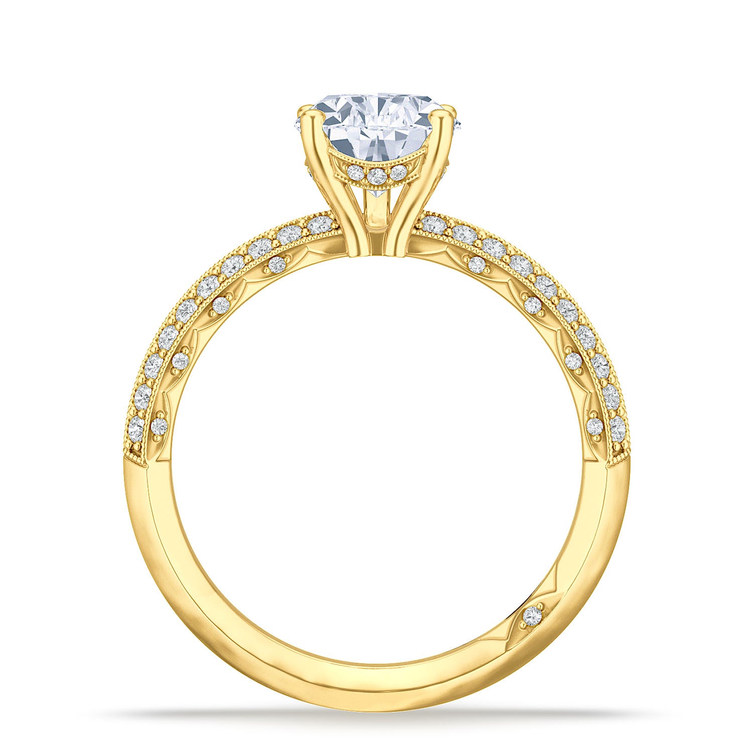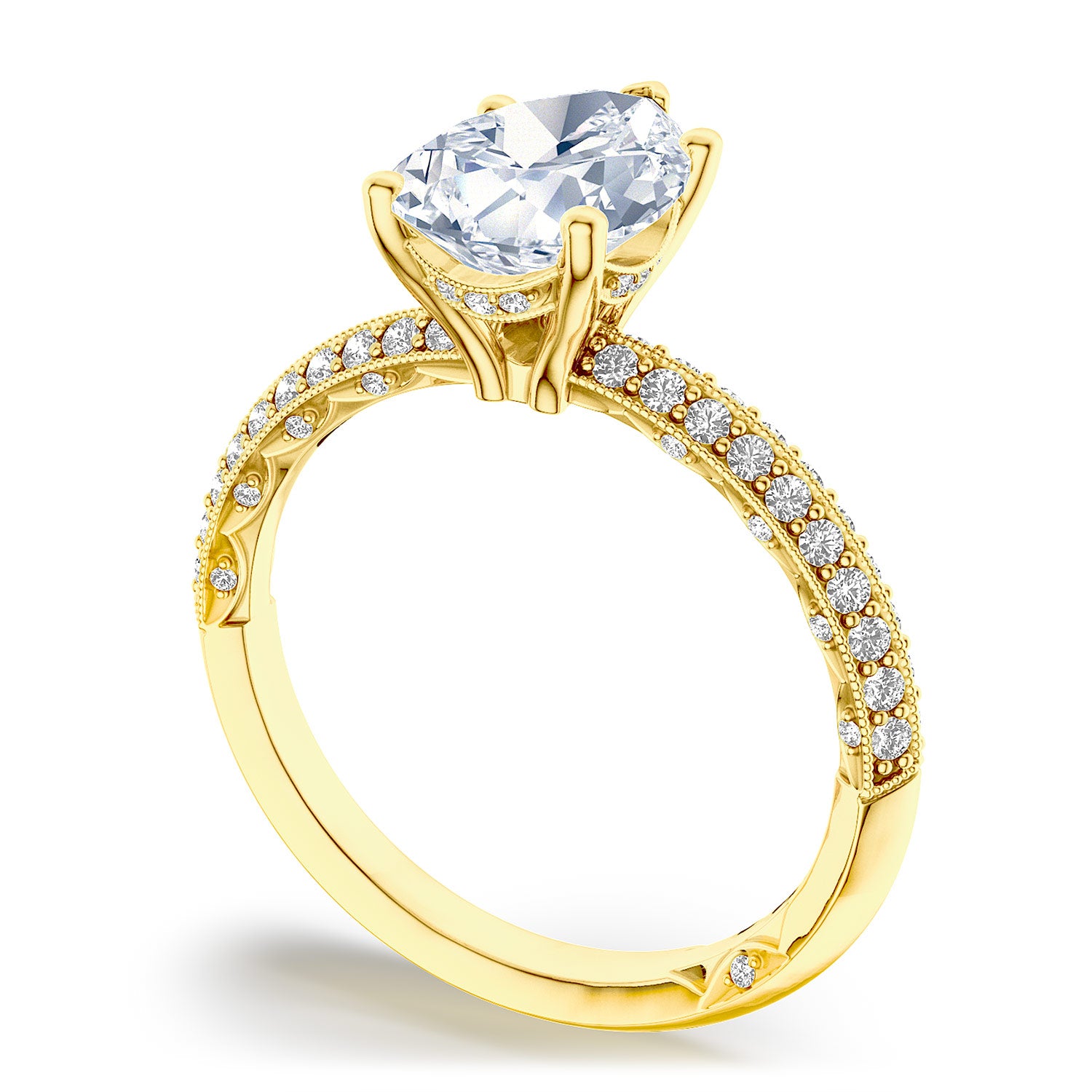This Knife Edge engagement ring reimagines this classic silhouette with delicate hidden crescents and a beautiful array of pavé diamonds emphasizing the size of the center stone.