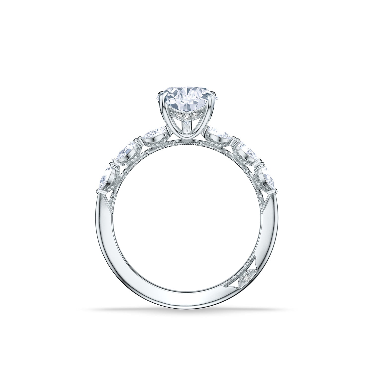 This intricately detailed engagement ring puts a spotlight on pear-shaped diamonds. Diamond accents and beading enhance an elegant crown with hidden bloom detail and a Sculpted Crescent inner face with crescent signature at the resting point.