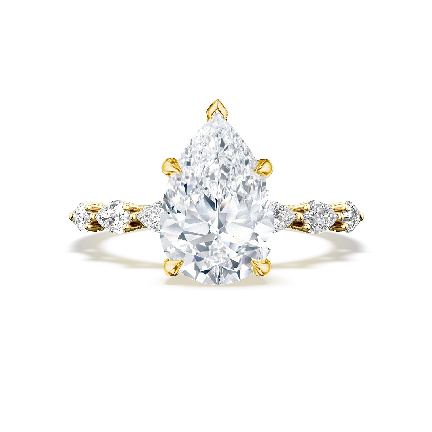 This intricately detailed engagement ring puts a spotlight on pear-shaped diamonds. Diamond accents and beading enhance an elegant crown with hidden bloom detail and a Sculpted Crescent inner face with crescent signature at the resting point.