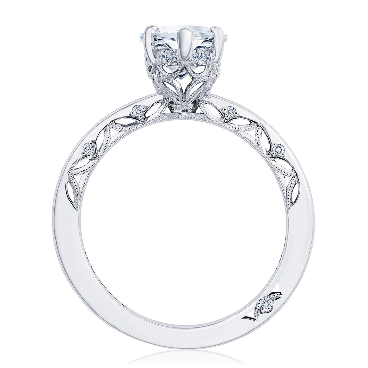 A high-polish ceiling accented with lace-like tracery makes for a stunningly airy setting. The hand-hewn milgrain and pinpoint diamonds add nuance, while a hidden bloom creates dimensional light. A Signature Crescent marks the resting point.