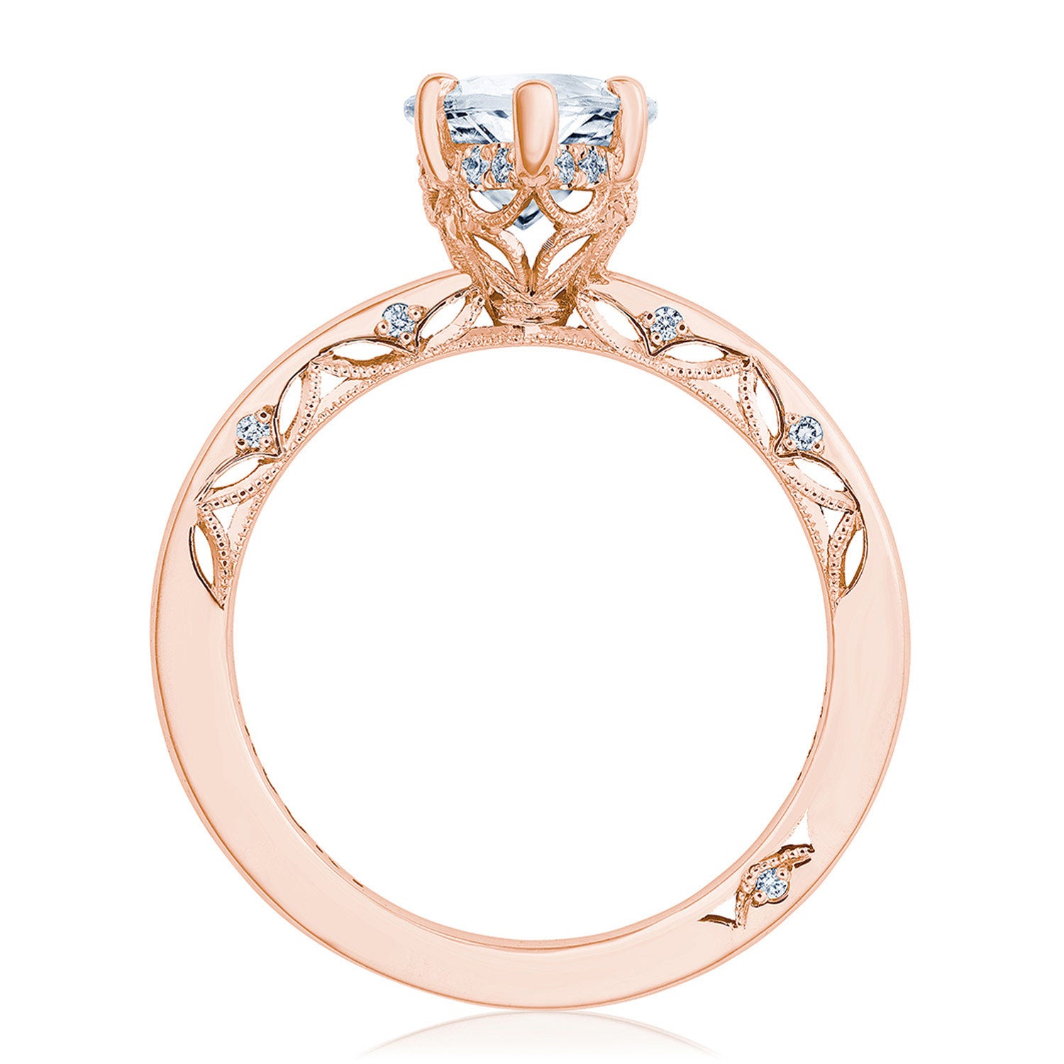 A high-polish ceiling accented with lace-like tracery makes for a stunningly airy setting. The hand-hewn milgrain and pinpoint diamonds add nuance, while a hidden bloom creates dimensional light. A Signature Crescent marks the resting point.