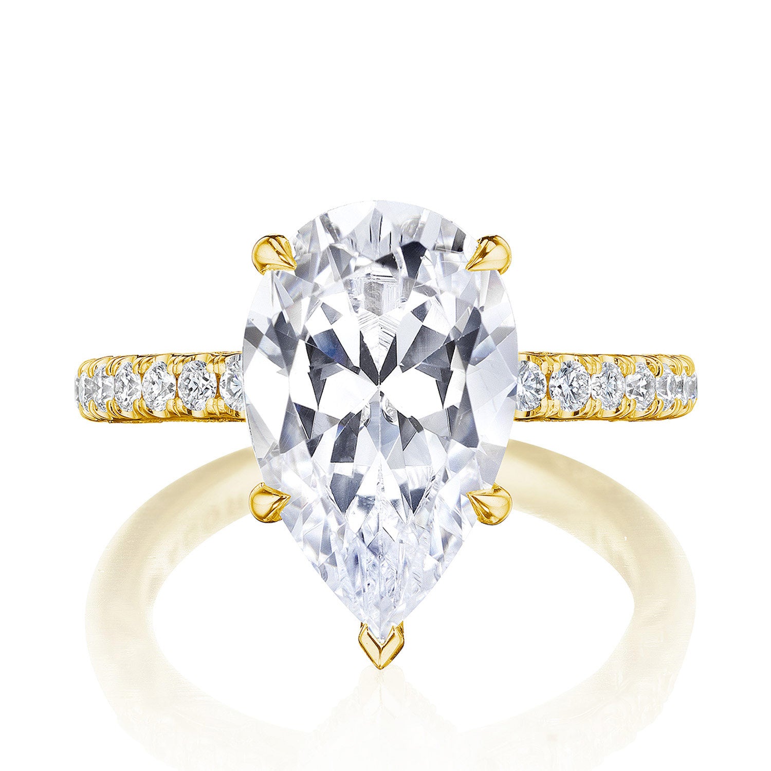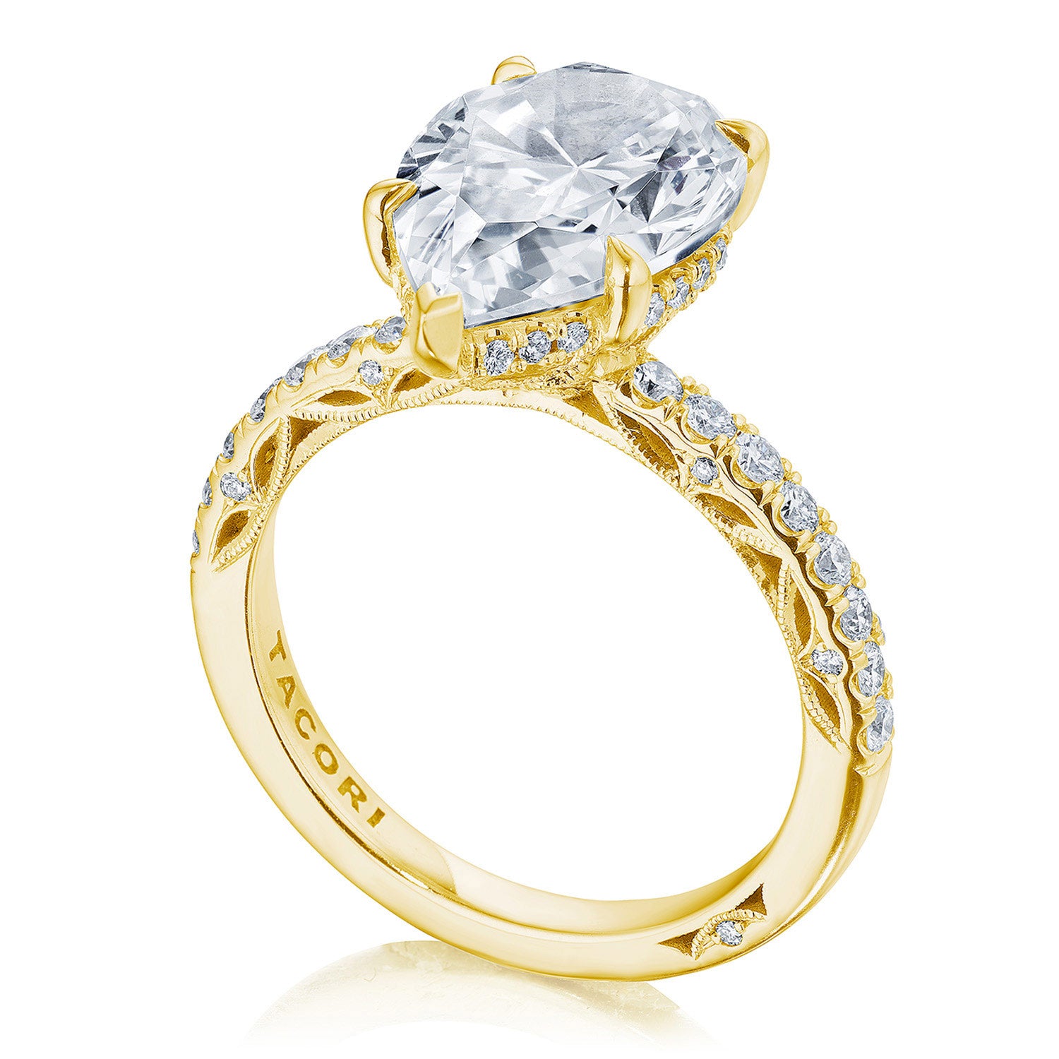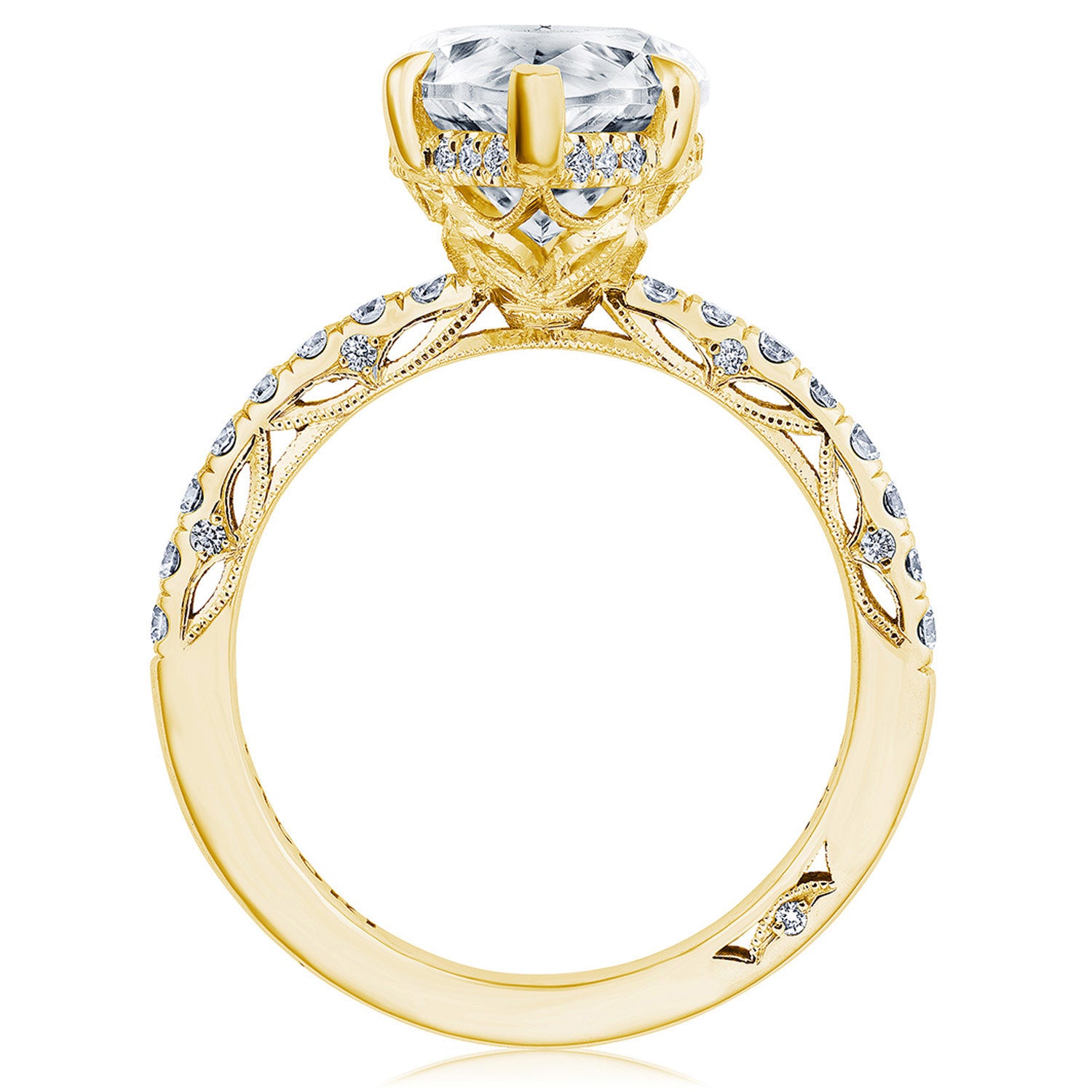 A French pavé ceiling adds dimensional light, while a hidden bloom and open air crown work illuminates the center stone. A complex and alluring lace-like Crescent Fabric gives stunning texture to the inner face profile.