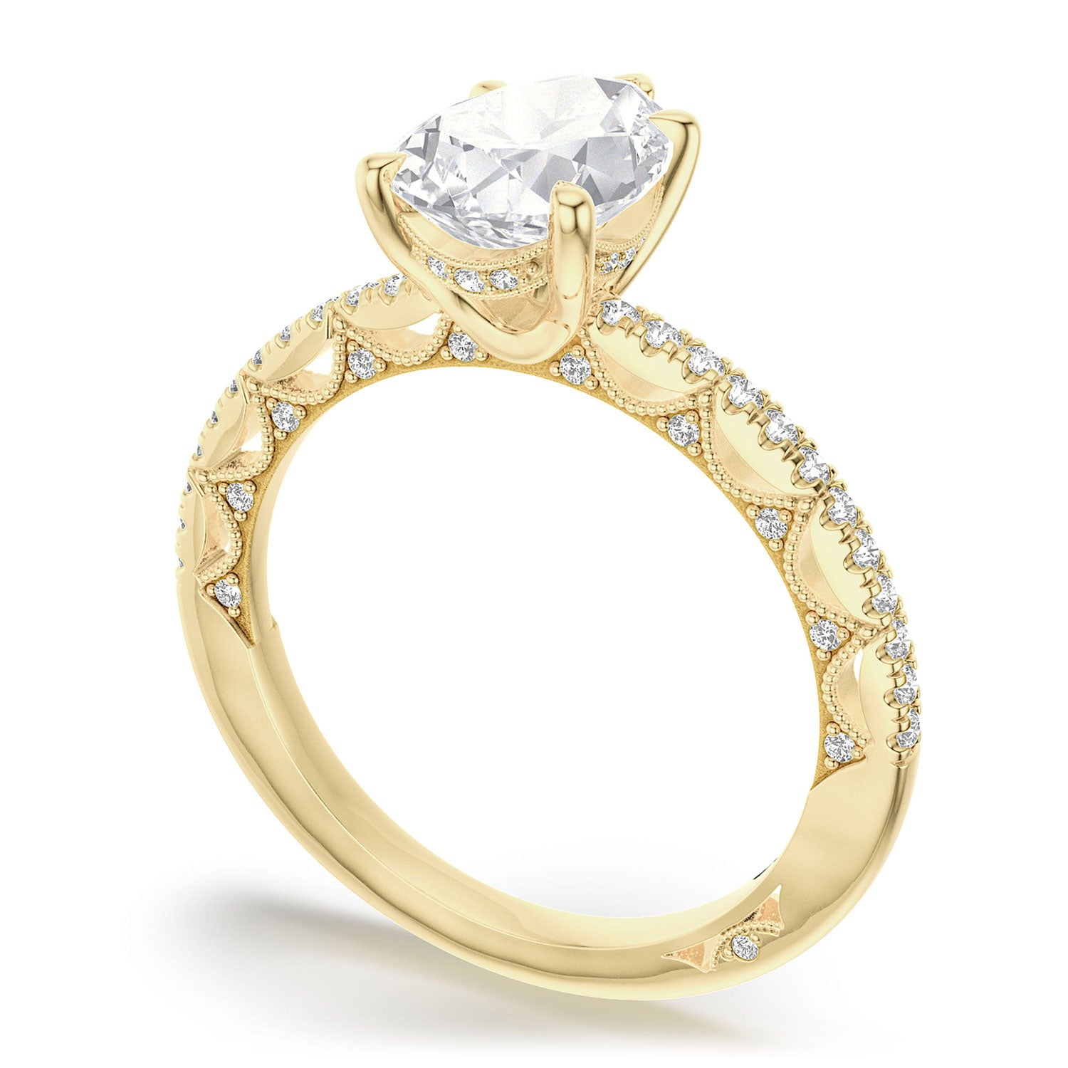 Milgrain-edged Crescents glow across the inner face, while round-brilliant diamonds, hand-set with triple beading, add radiance. A pave ceiling traces towards the center stone, which floats above a hidden bloom on a Classic 360 foundation.