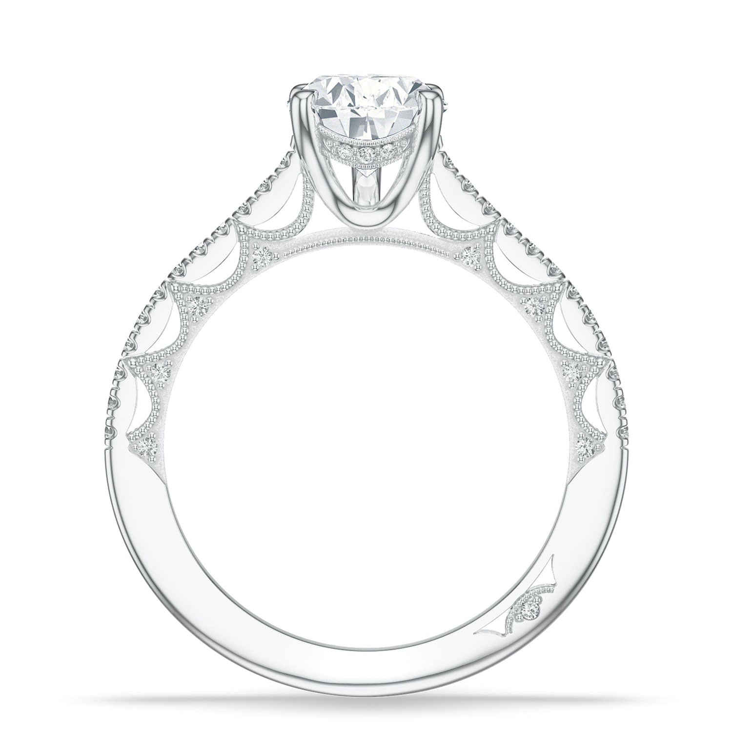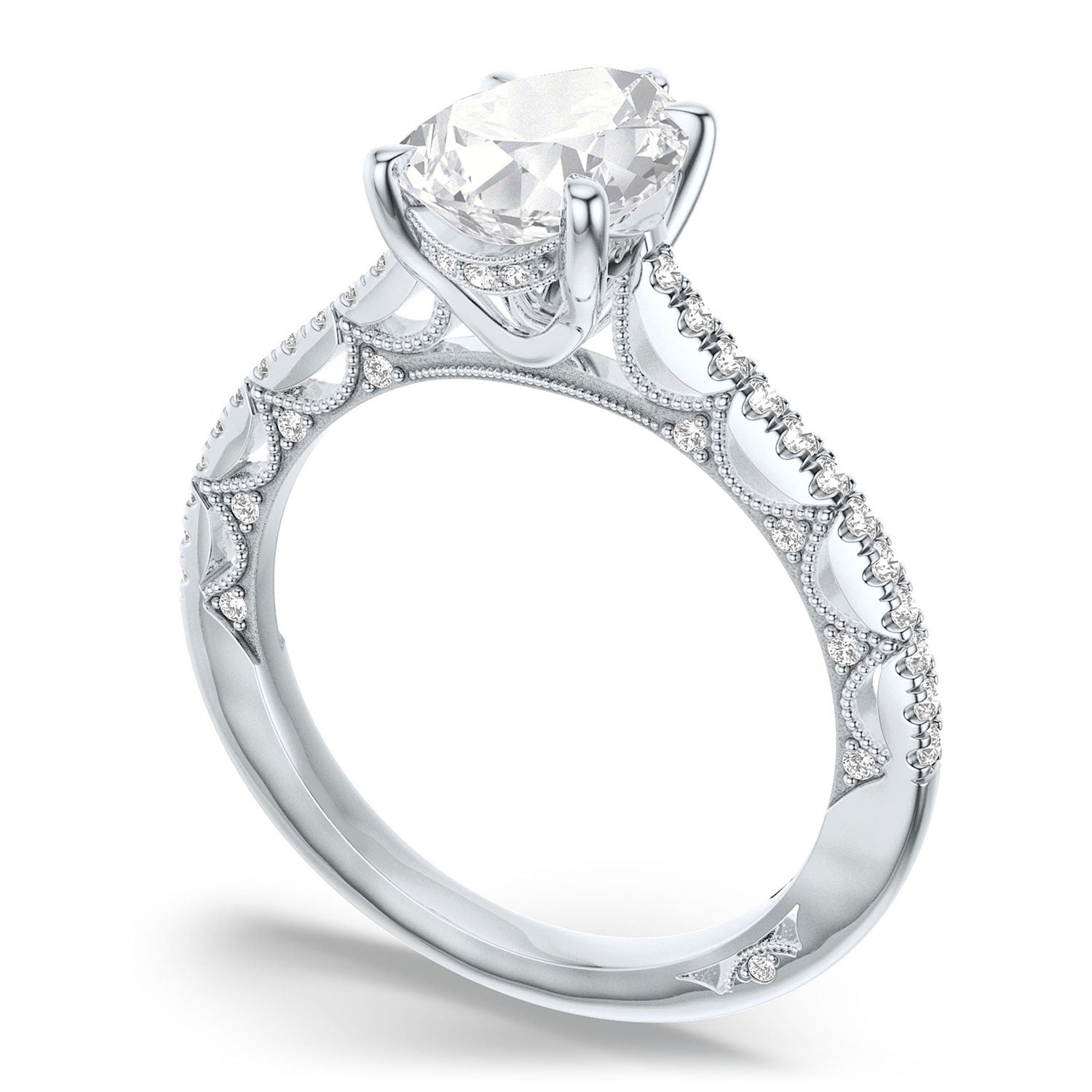 Milgrain-edged Crescents glow across the inner face, while round-brilliant diamonds, hand-set with triple beading, add radiance. A pave ceiling traces towards the center stone, which sits above a hidden bloom on a Cathedral foundation.