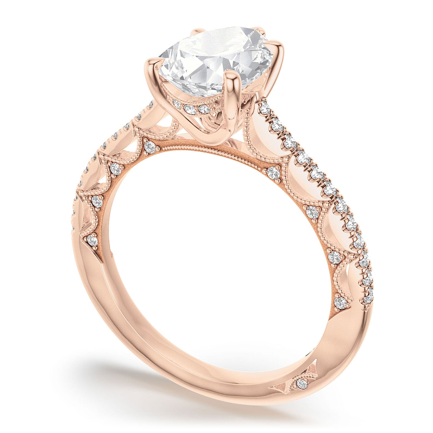 Milgrain-edged Crescents glow across the inner face, while round-brilliant diamonds, hand-set with triple beading, add radiance. A pave ceiling traces towards the center stone, which sits above a hidden bloom on a Cathedral foundation.