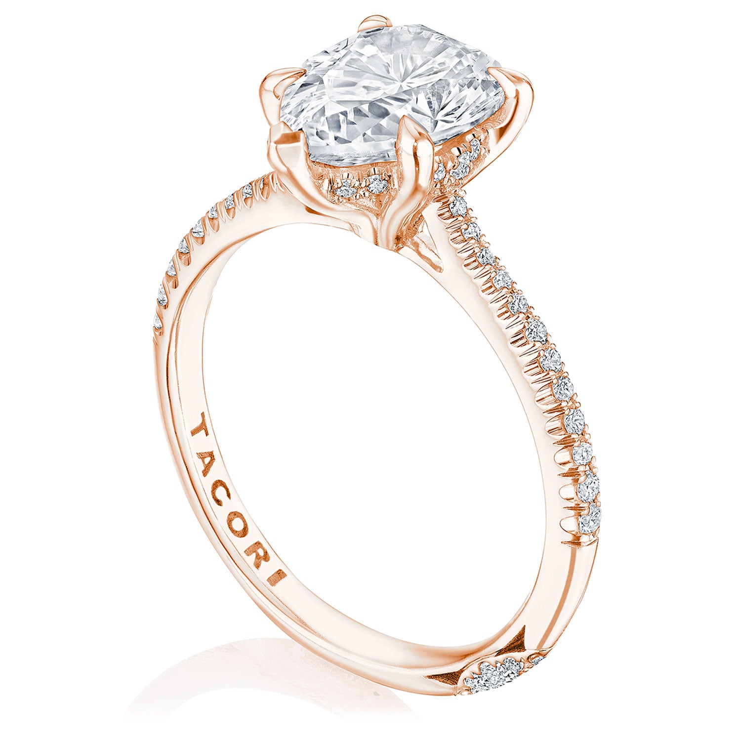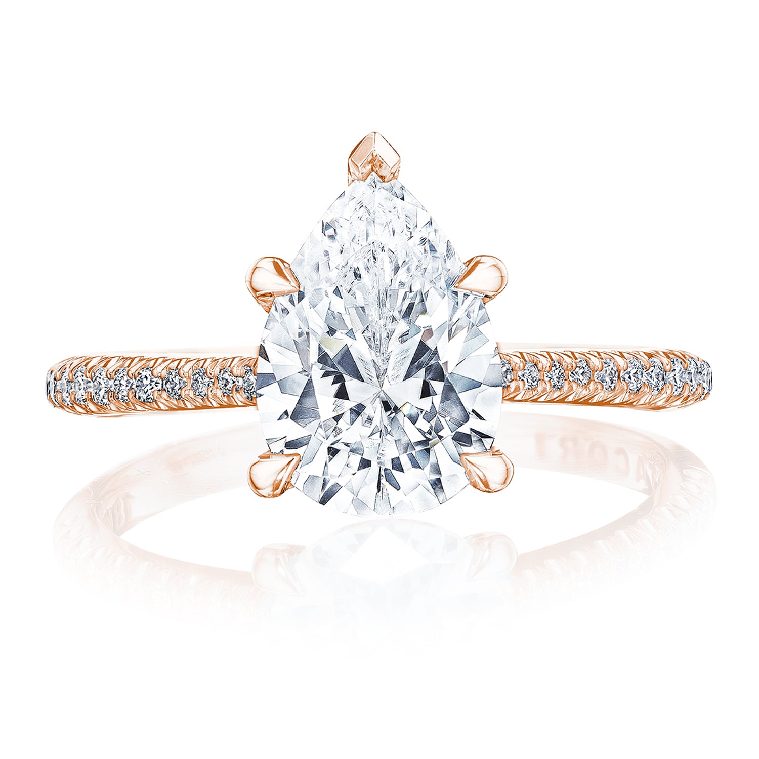 Designed by our Founder, Haig Tacorian, this stunning four-prong, solitaire engagement ring features a pear-cut center stone on a French-pavé set diamond band. Discover the hidden bloom of diamonds underneath the crown and the diamond-studded crescent signature at the foundation.