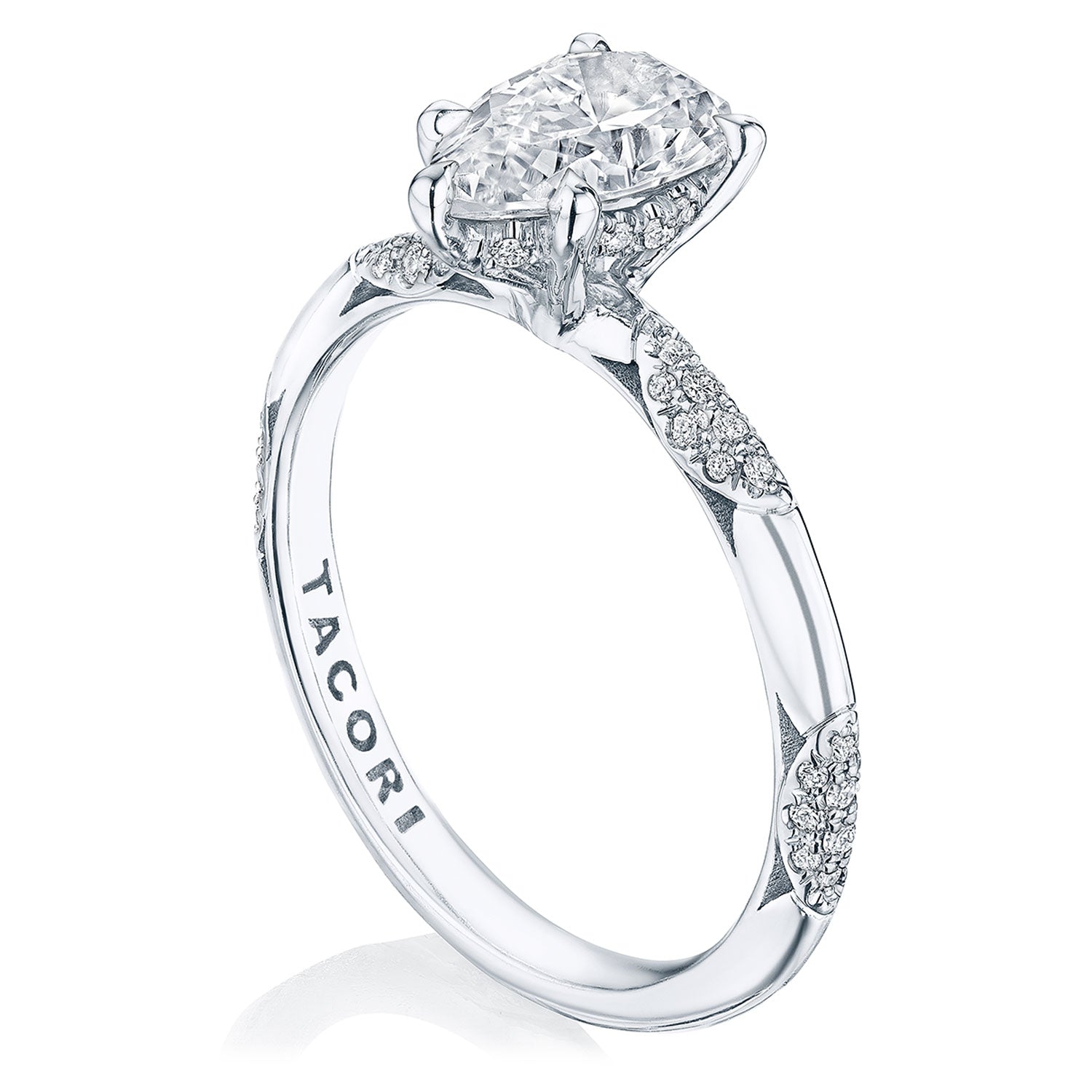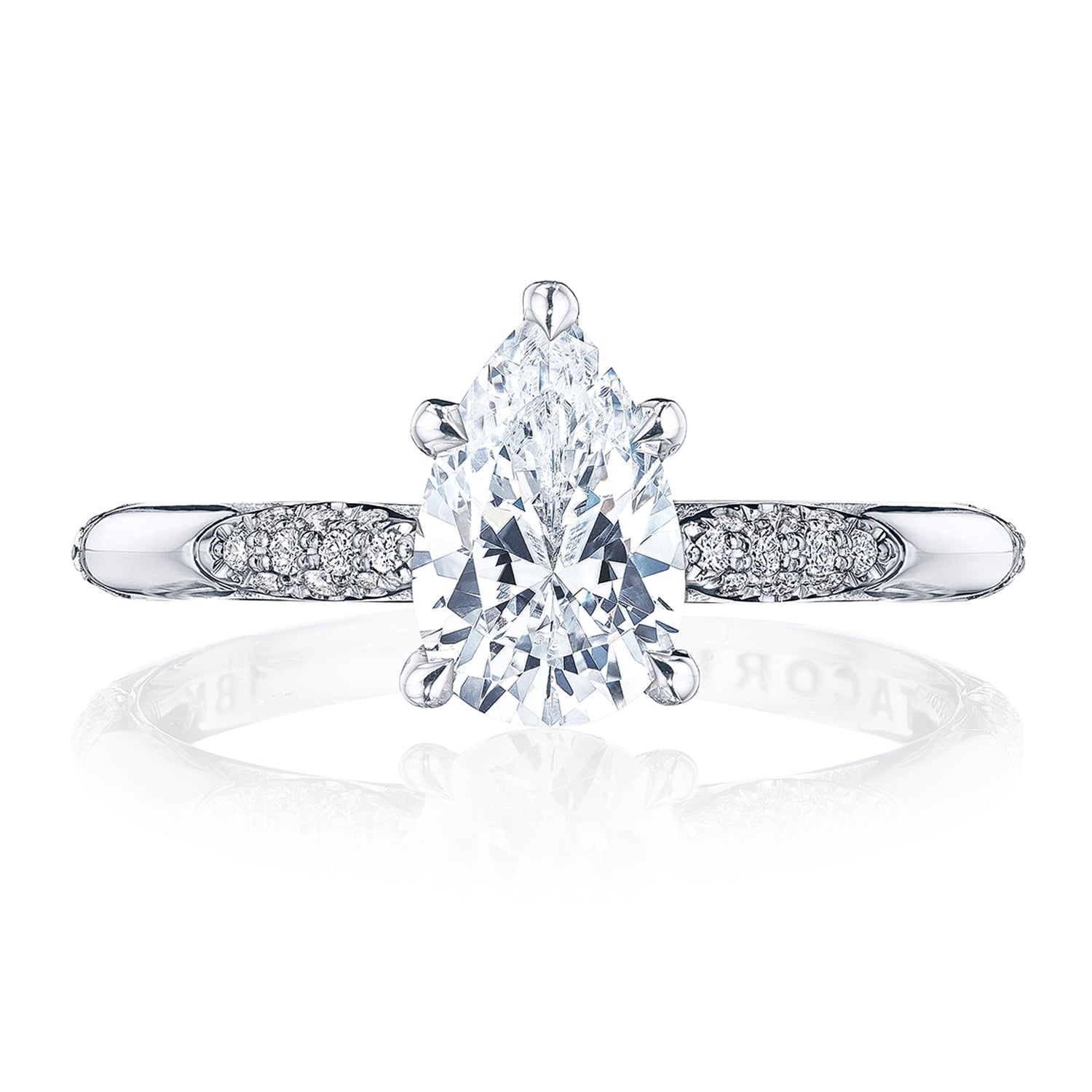 Designed by our Founder, Haig Tacorian, this Classic 360° Foundation, 4-prong engagement ring with a pear-cut center features a touch of sparkle all around the band. Discover the diamond-intense Tacori crescent signature.