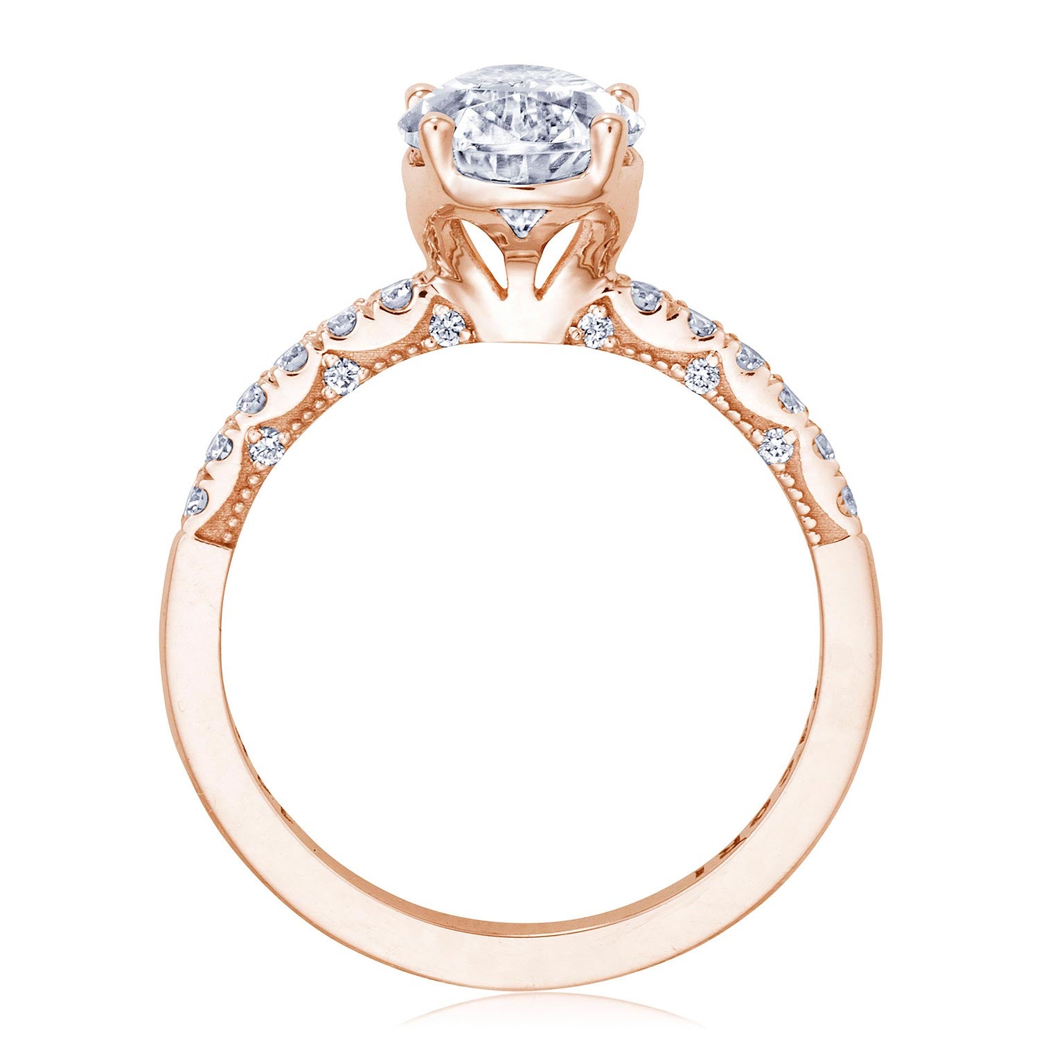 Less metal, means more scene-stealing diamond action. A pear shaped diamond solitaire rests gently on a diamond band with french pavé, revealing more diamond than metal. This ring features the Coastal Crescent inner face with pinpoint diamond details for a truly regal look.