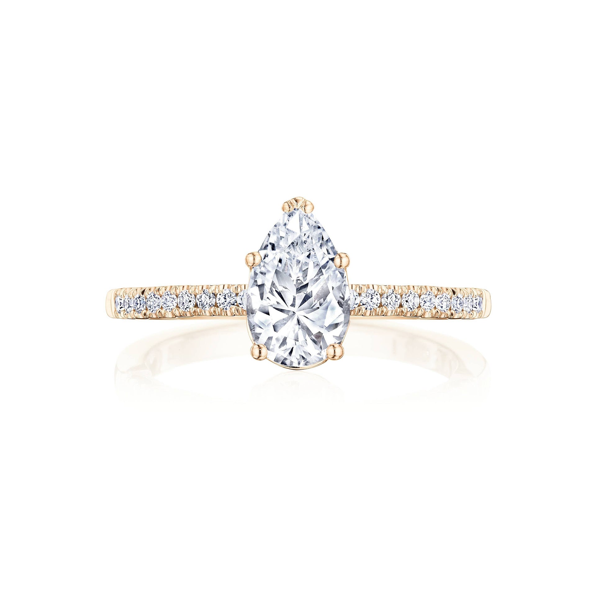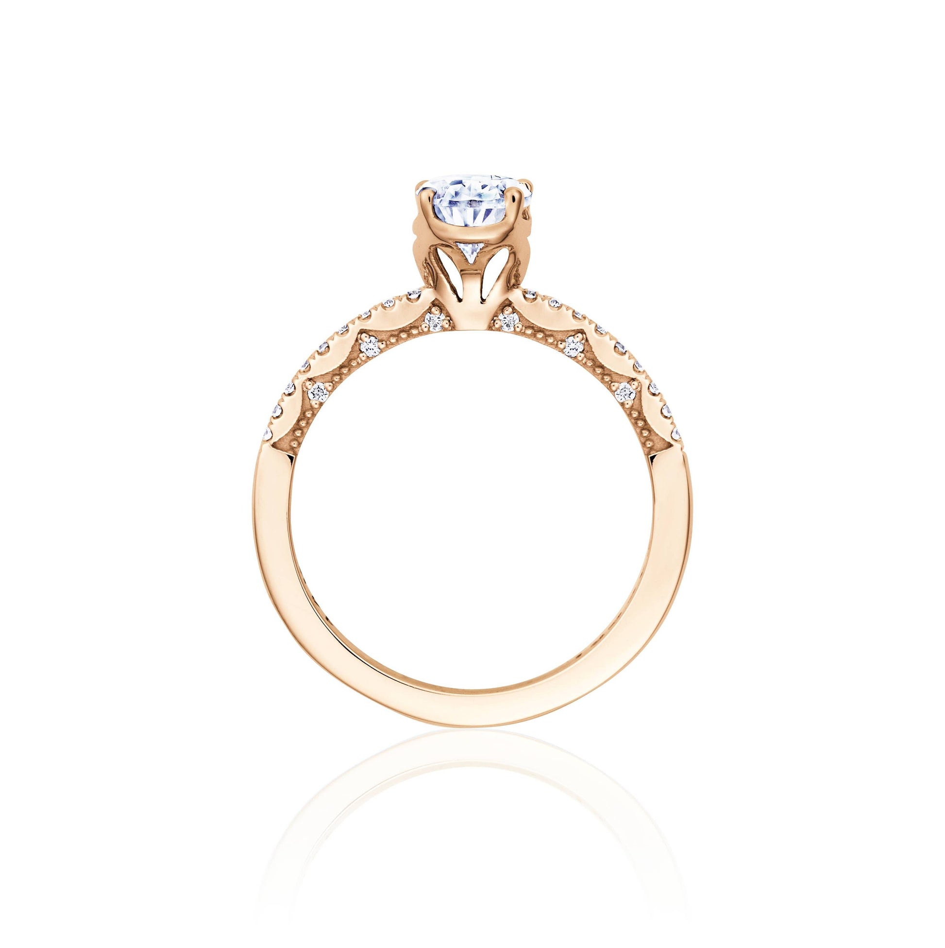 Less metal, means more scene-stealing diamond action. An princess cut diamond solitaire rests gently on a diamond band with french pavé, revealing more diamond than metal. This ring features the Coastal Crescent inner face with pinpoint diamond details for a truly regal look.