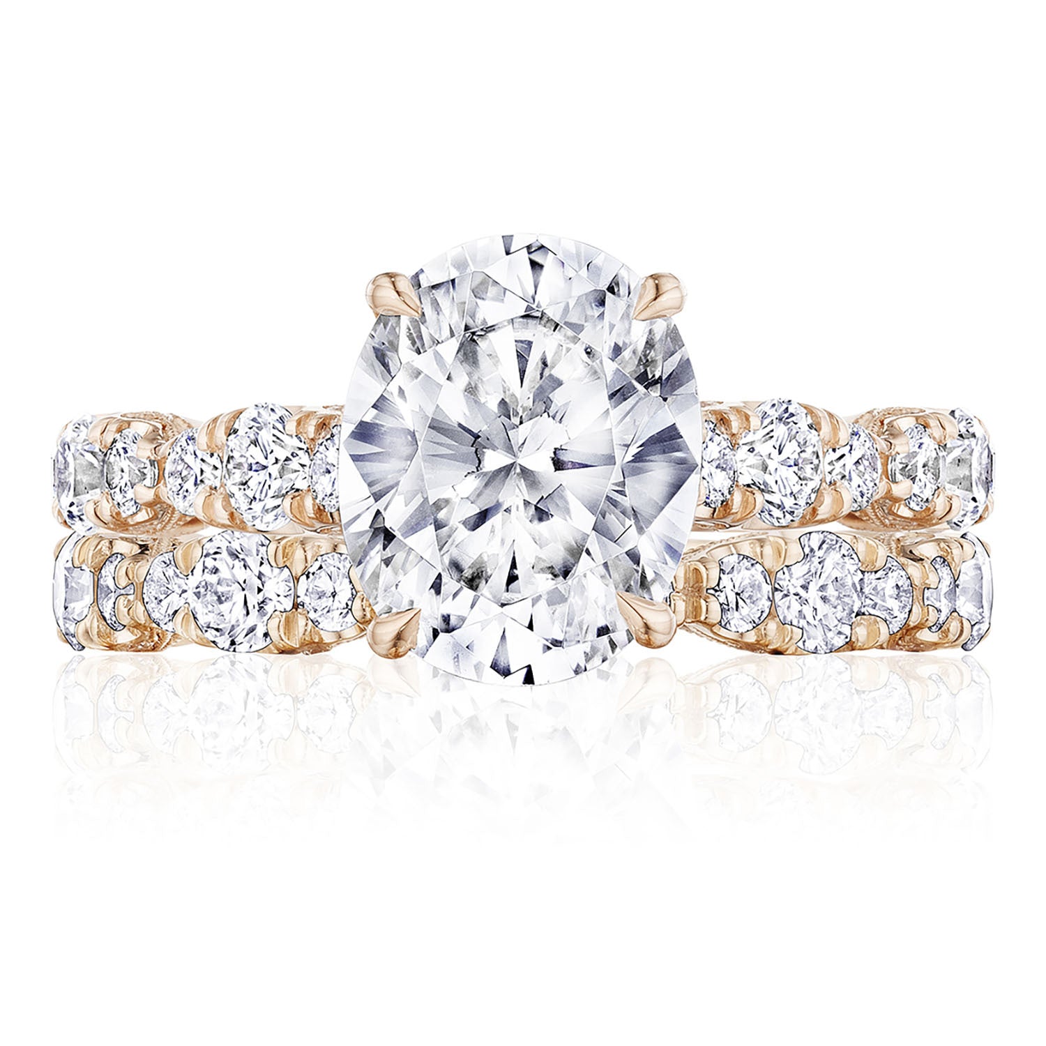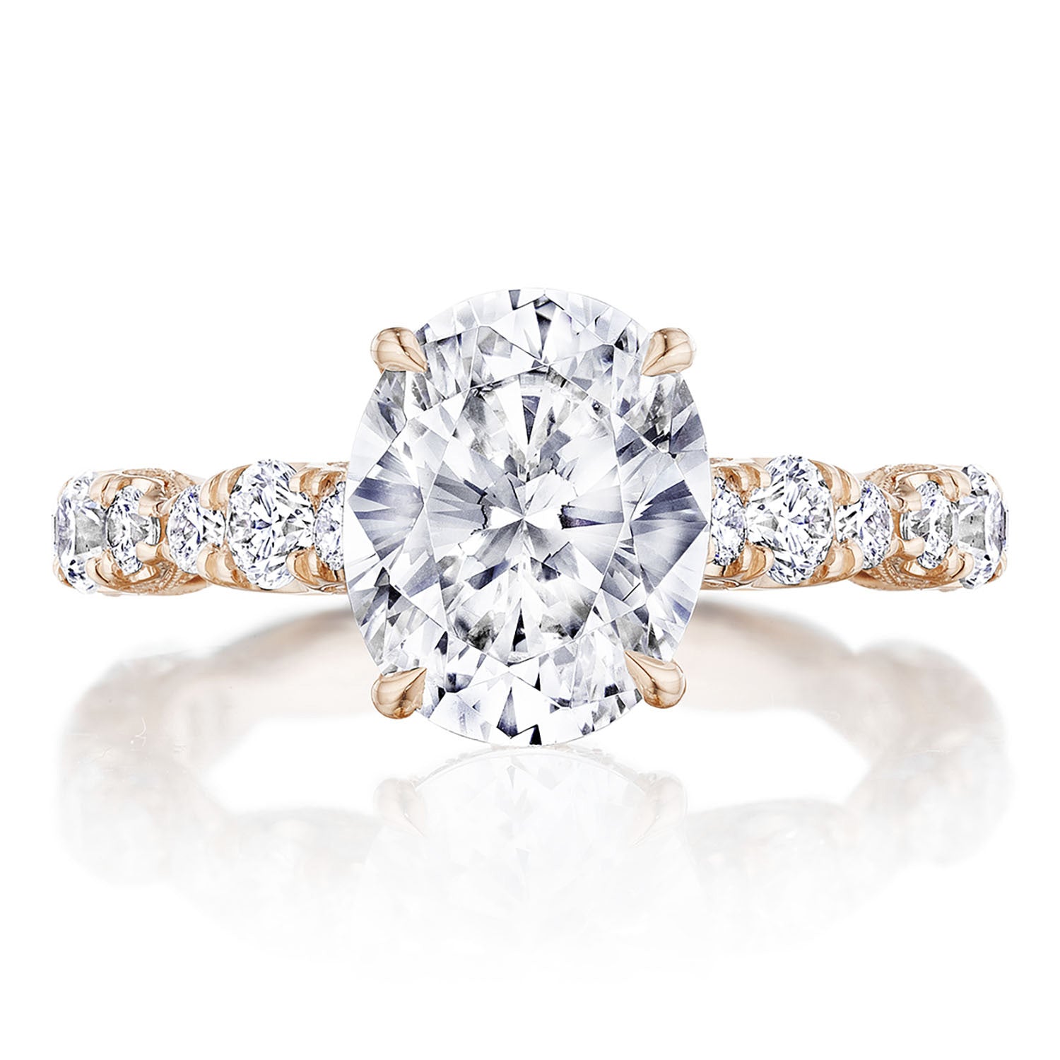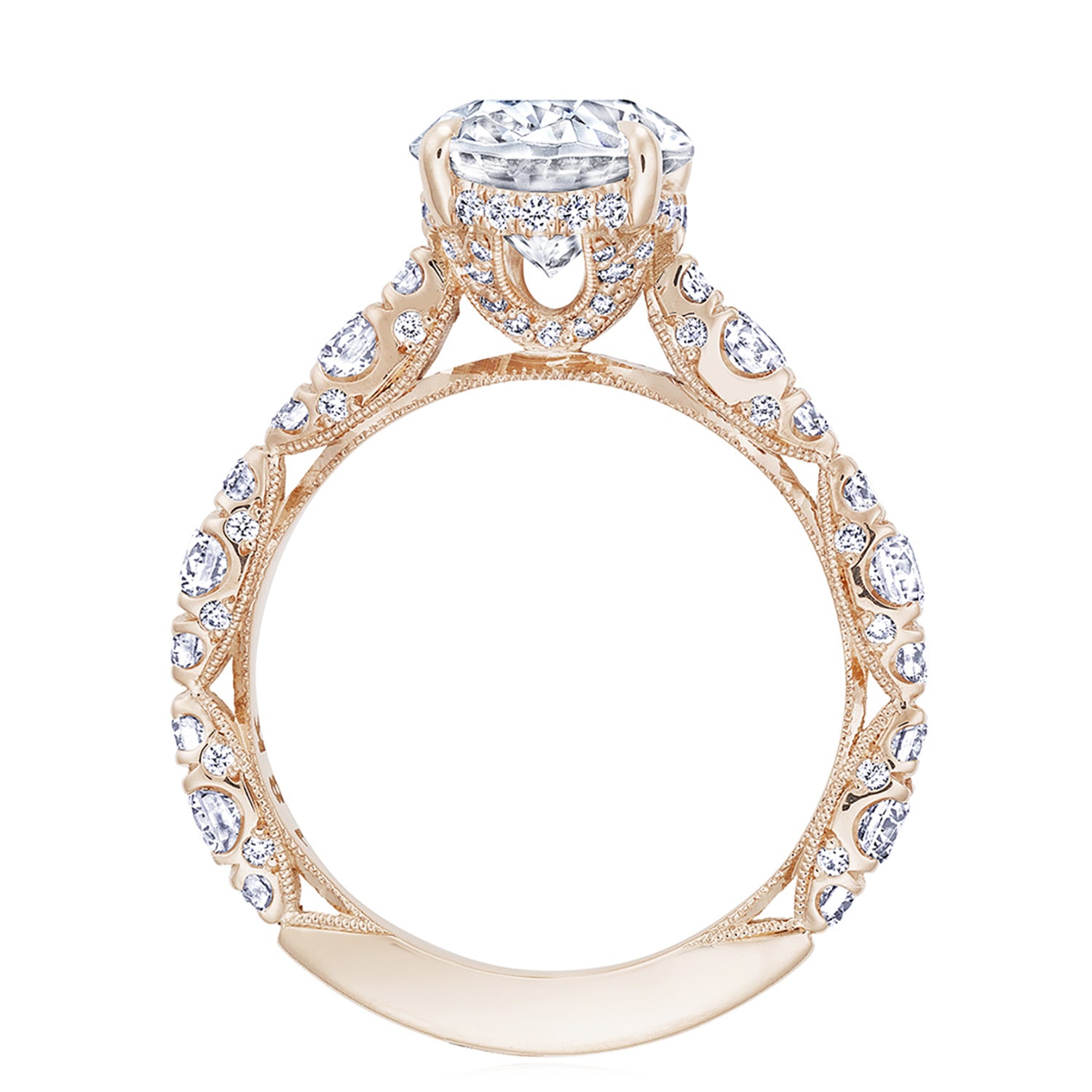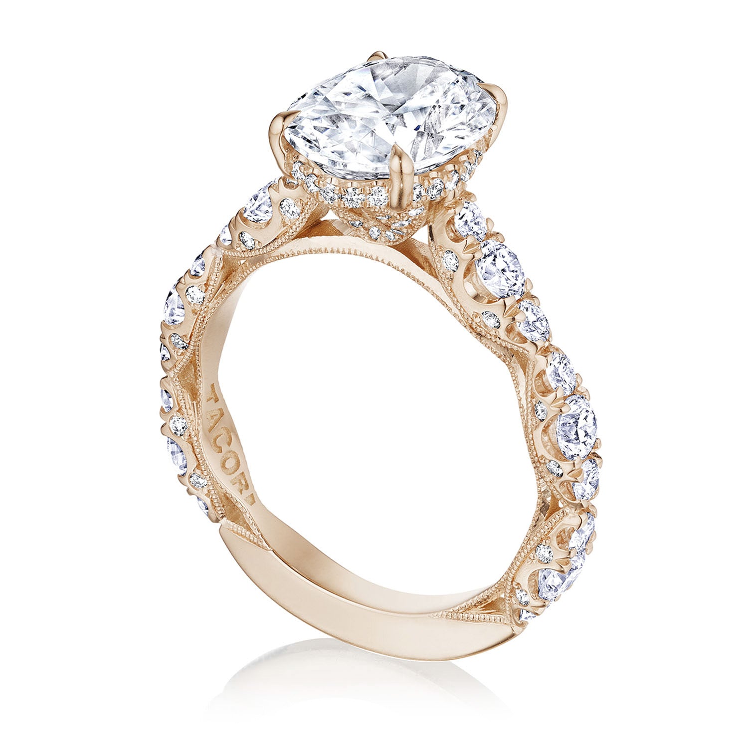 Beautiful marquise shapes with brilliant graduating diamonds dance along this stunning oval cut diamond engagement ring. Discover the hidden crescent diamond underlay that acts as a pedestal of diamonds to spotlight the center diamond.