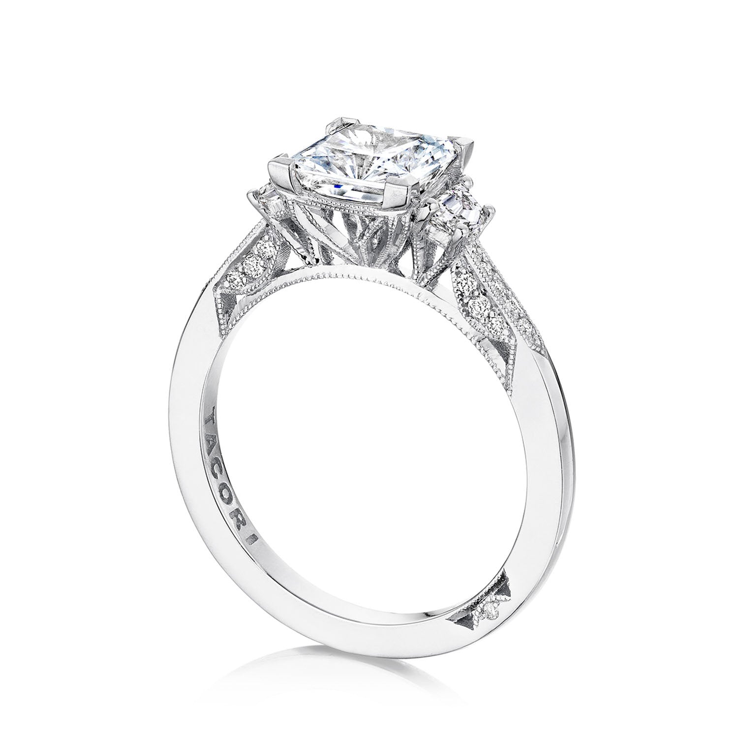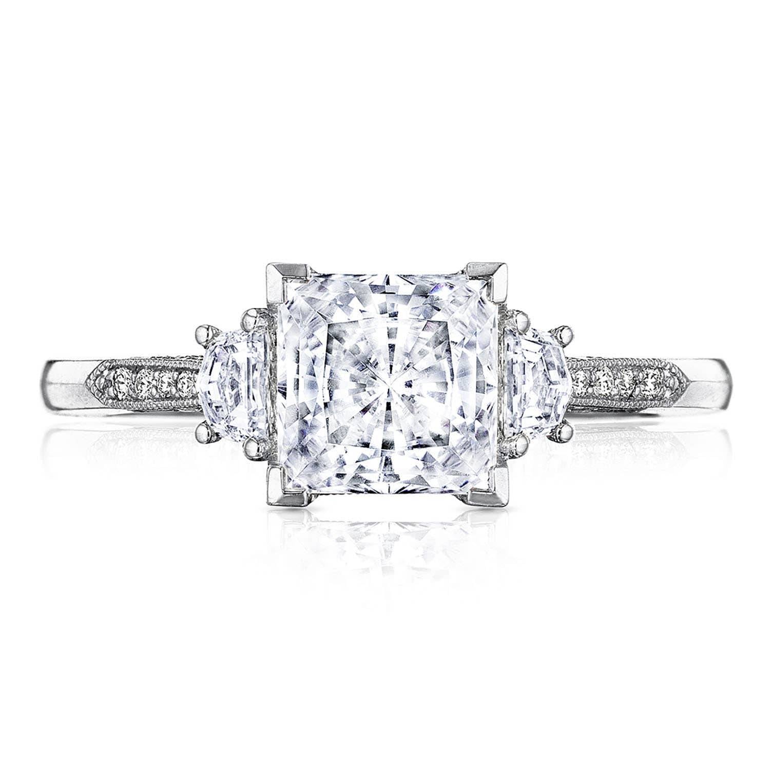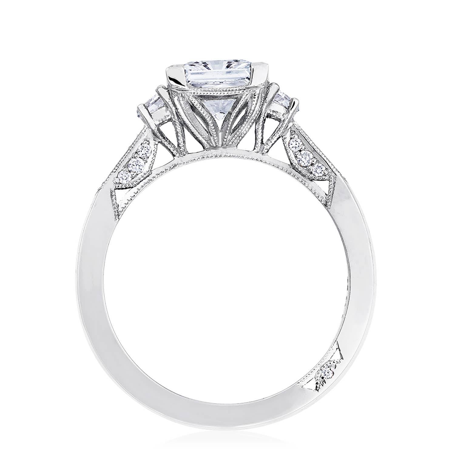 Simply stunning, simply Tacori. A traditionally elegant picture-frame prong outlines your princess center, which is further brought to life by two high-intensity cadillac side stones on a high polished band with pavé diamond detailing.