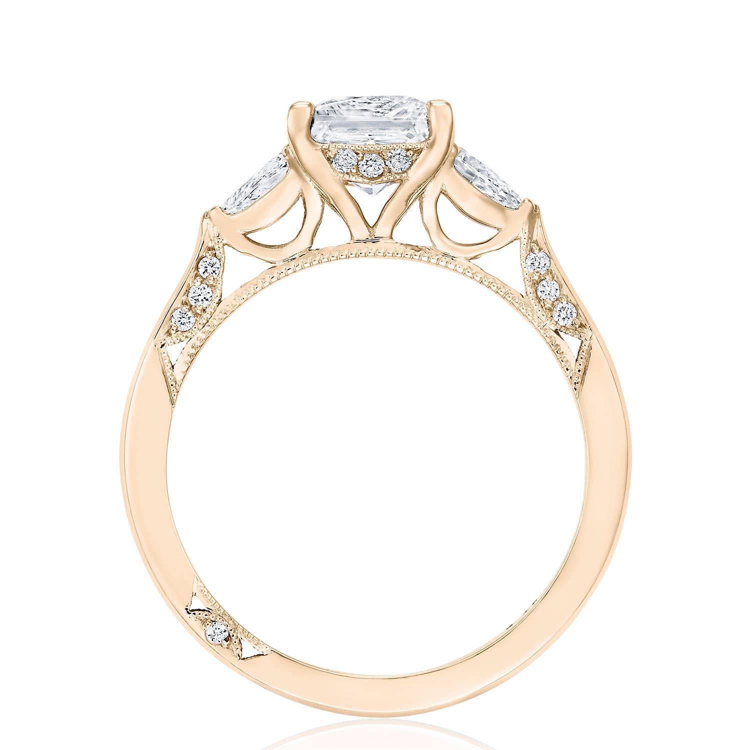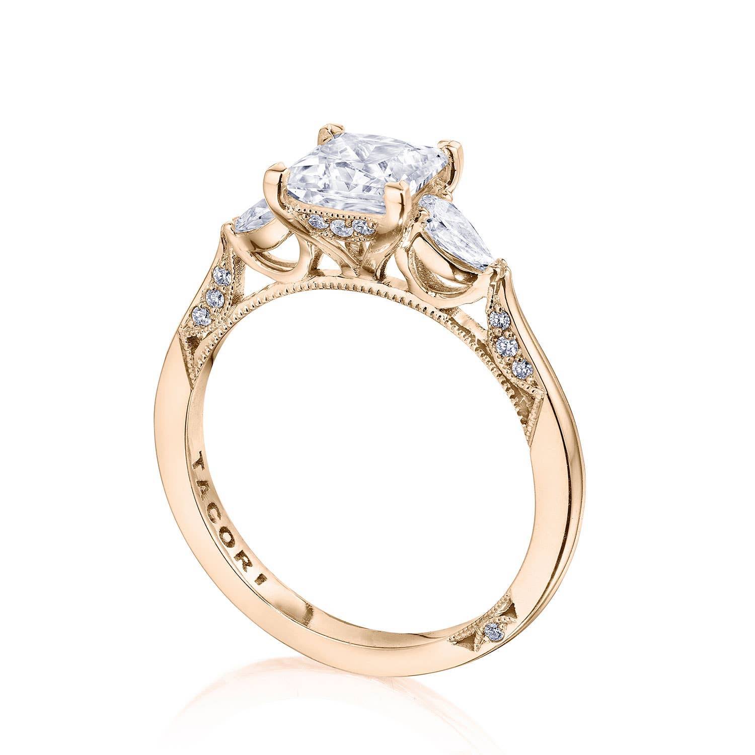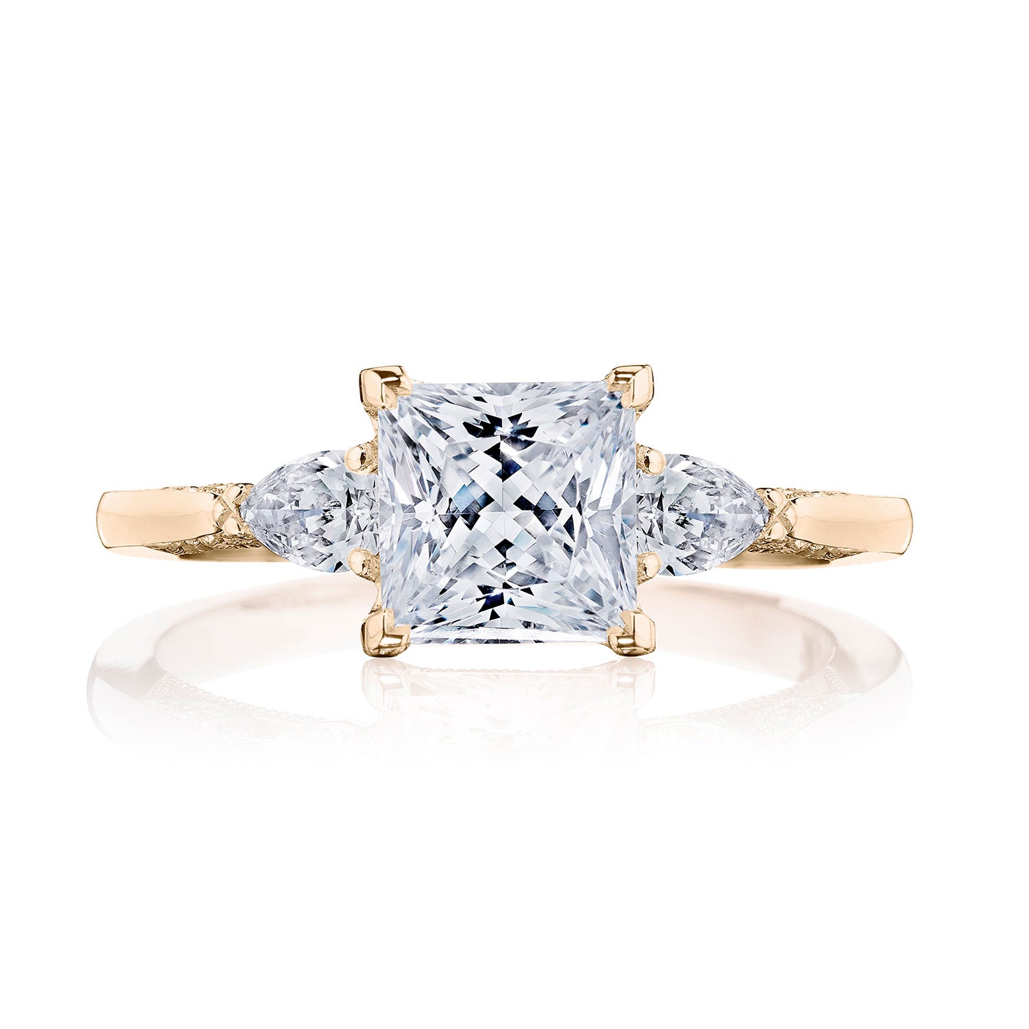 Let your diamond engagement ring stand out by contrasting your side stones with your center diamond! Pear-shaped side stones graduate to the princess center, bringing a magical contrast to bring about beauty from every angle.