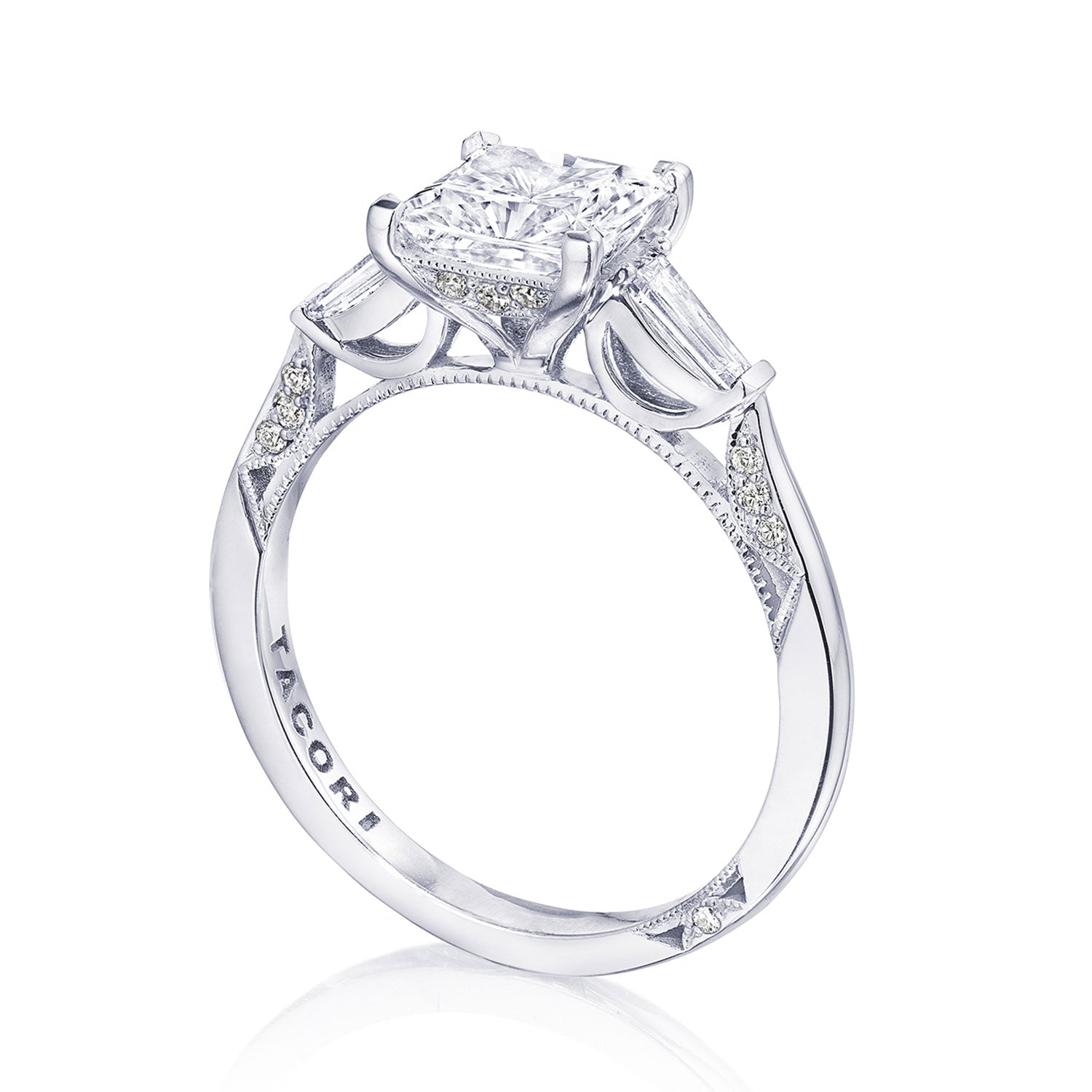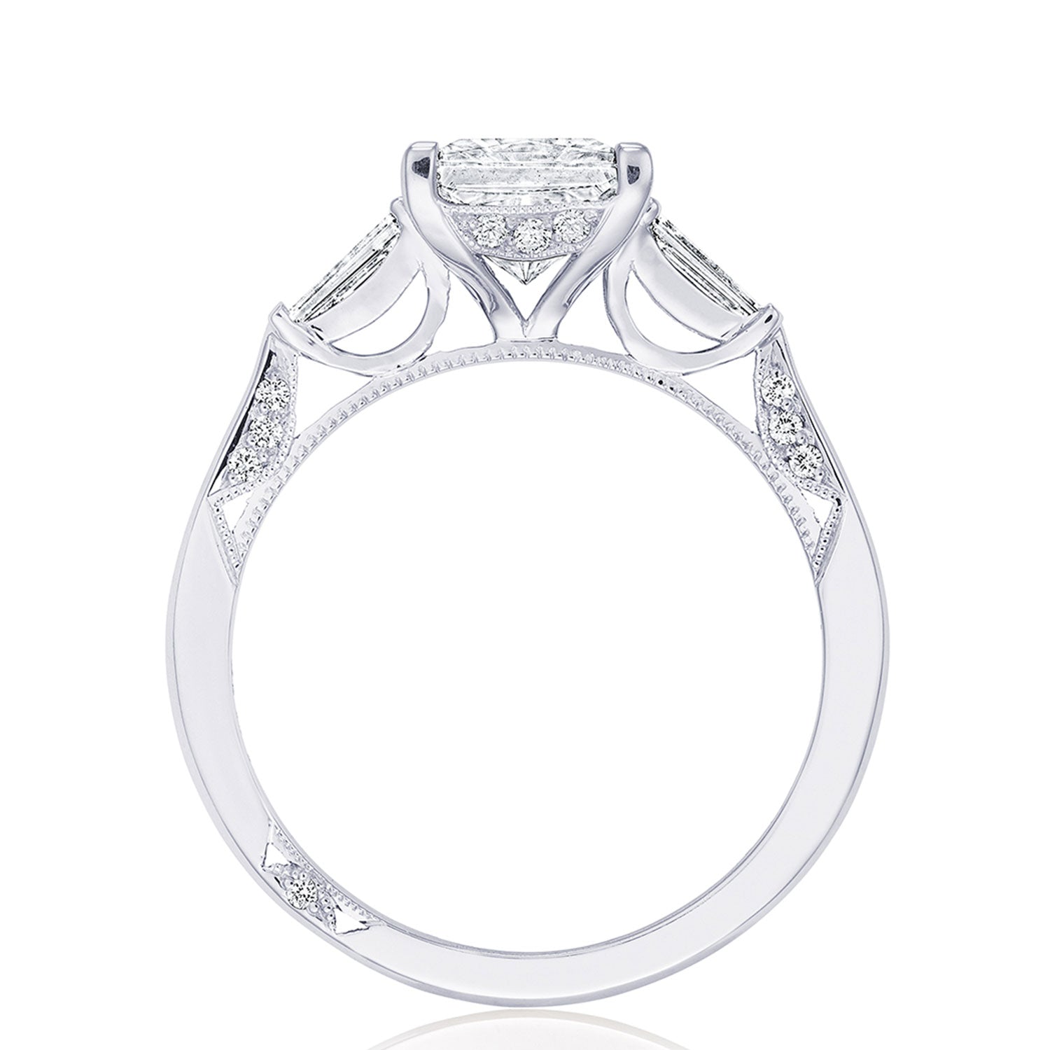 Let your diamond engagement ring stand out by contrasting your side stones with your center diamond! Baguette side stones graduate to the princess center, bringing a magical contrast to bring about beauty from every angle.