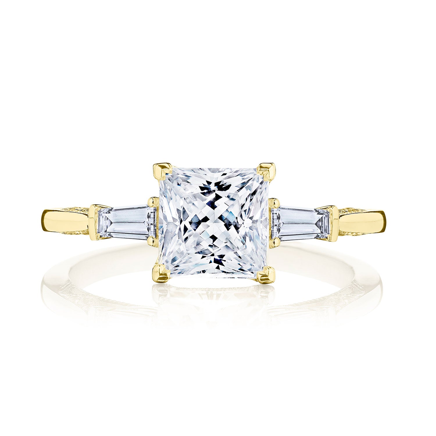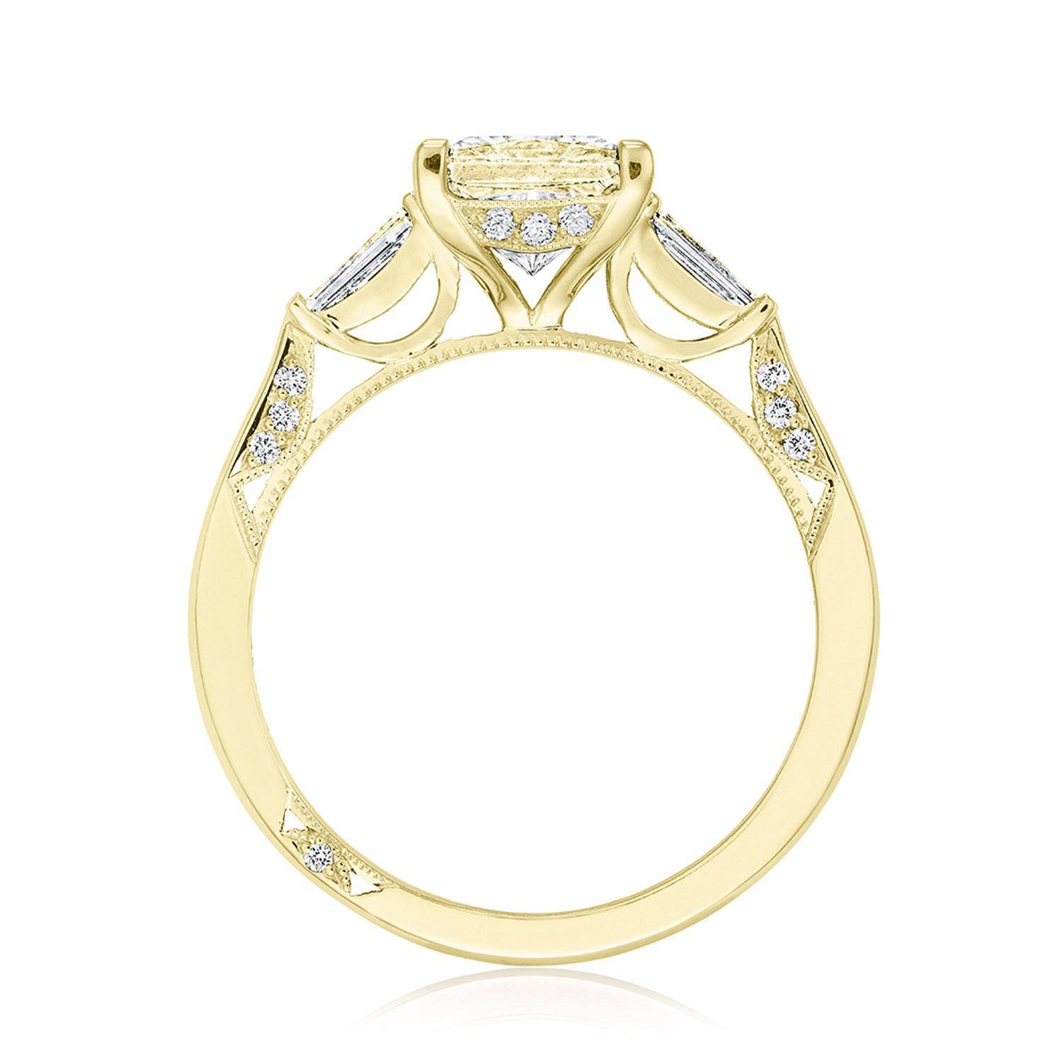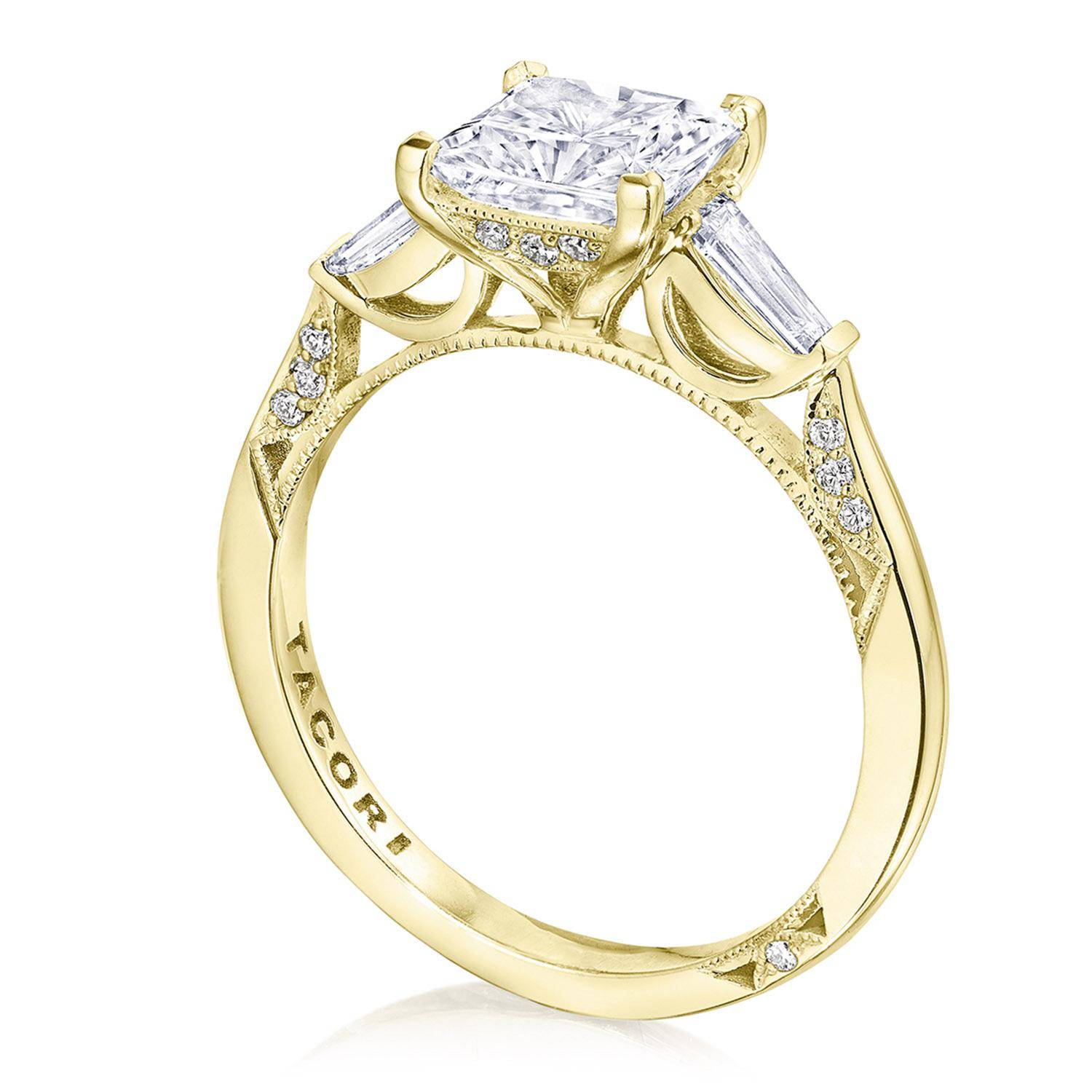 Let your diamond engagement ring stand out by contrasting your side stones with your center diamond! Baguette side stones graduate to the princess center, bringing a magical contrast to bring about beauty from every angle.
