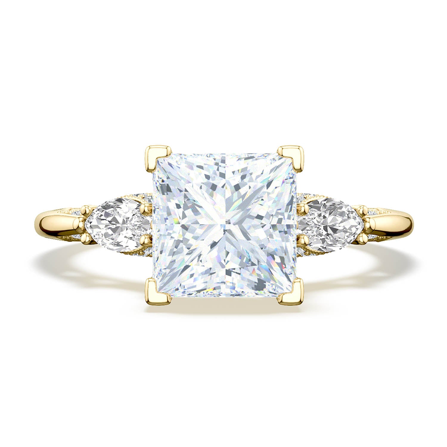 A modern twist to a classic three-stone style by featuring marquise diamonds. A Catherdral foundation with raised Tacori crescents on the shoulders and milgrain beading outlining each area, this ring elegantly shines from every angle.