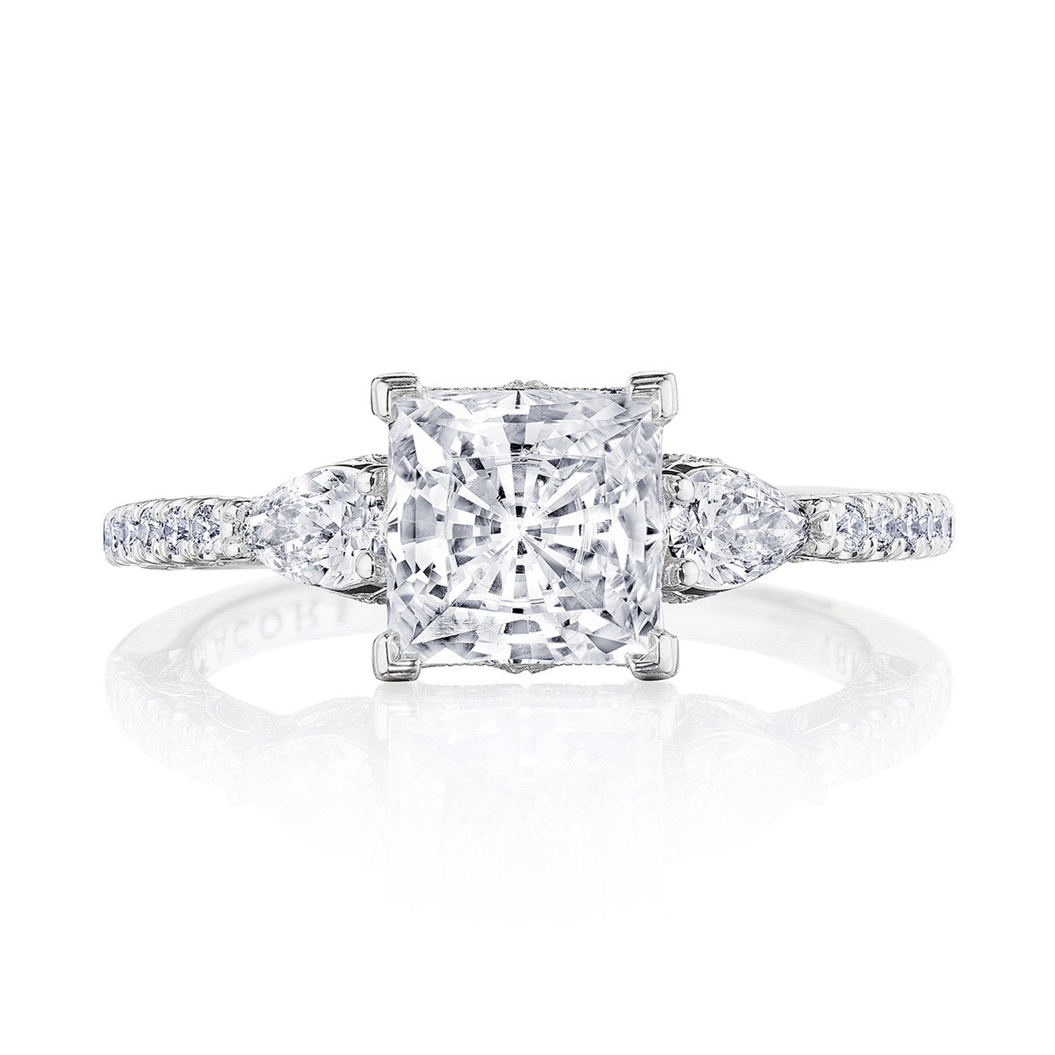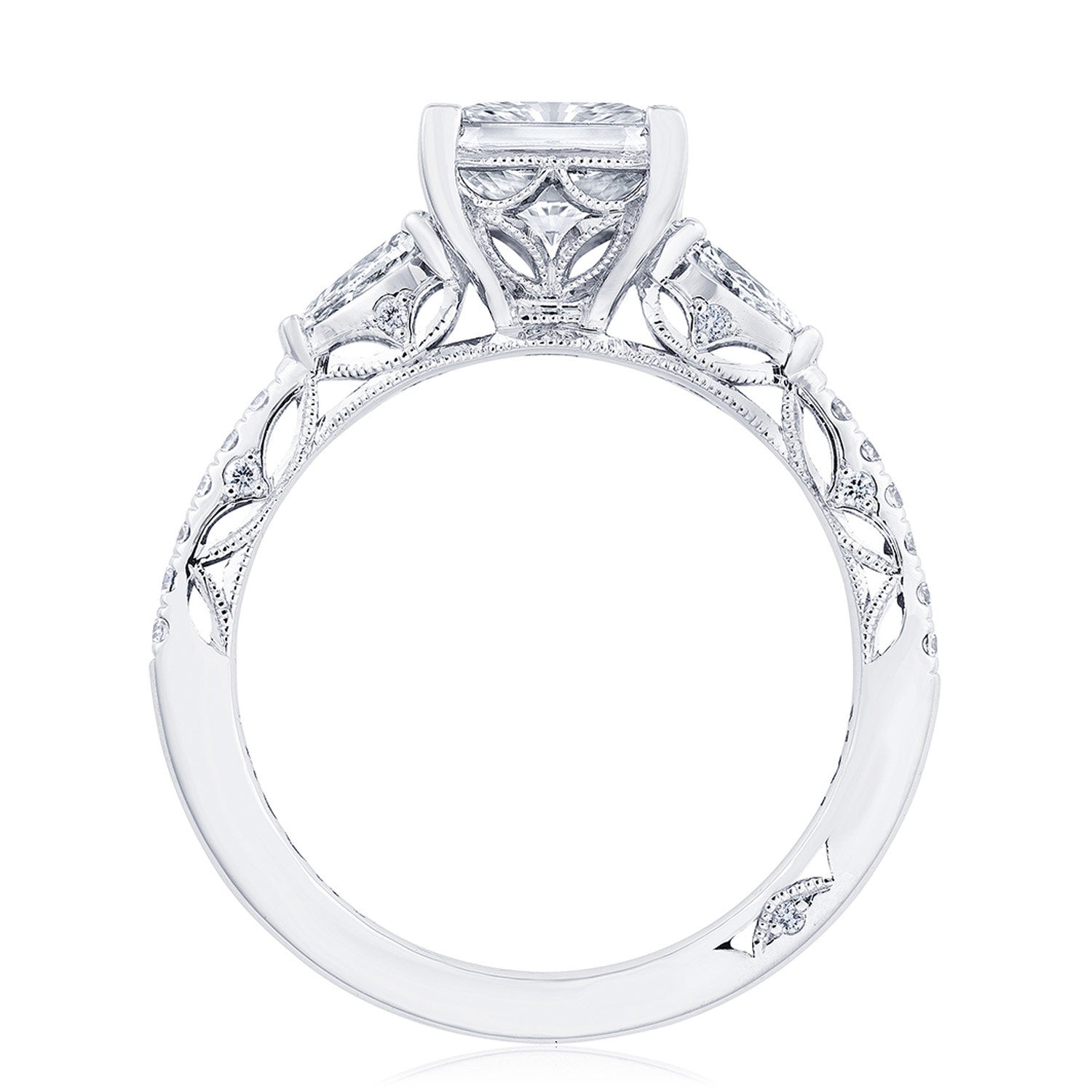 This three stone ring features distinctive pear side stones that sit atop a lace-like crown and foundation of complex, milgrain-edged Dantela Crescent Fabric. Meticulous, hand-set French pavé leads up the ceiling for eye-catching brilliance.