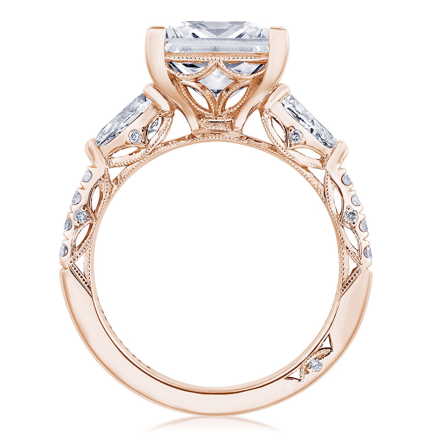 This three stone ring features distinctive pear side stones that sit atop a lace-like crown and foundation of complex, milgrain-edged Dantela Crescent Fabric. Meticulous, hand-set French pavé leads up the ceiling for eye-catching brilliance.