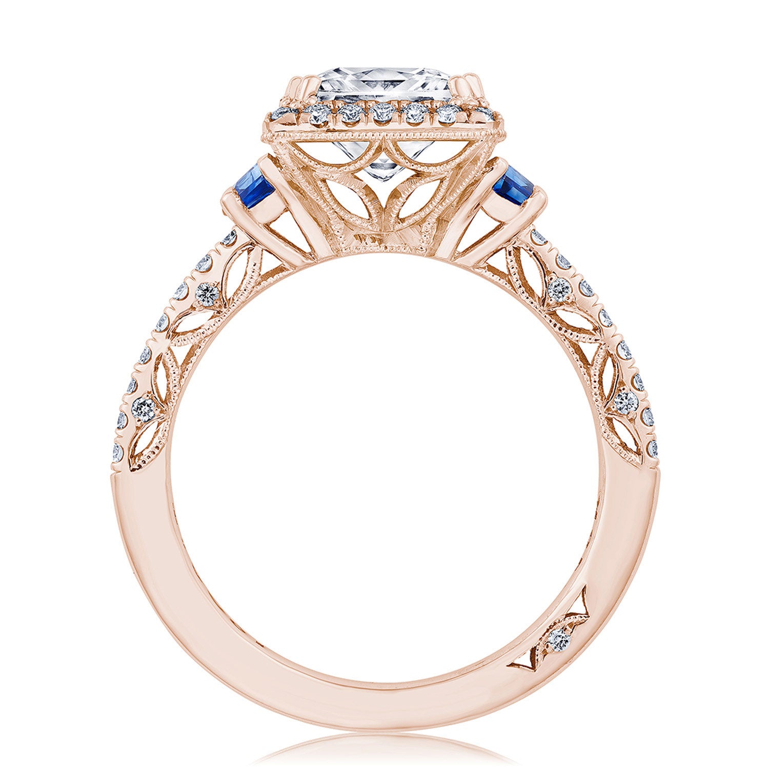This elegant three-stone setting is exceptionally detailed. A Spotlight Bloom with blue sapphire Cadillac-cut side stones sit atop a meticulous French pavé band enhanced by the lace-like, Dantela Crescent Fabric.