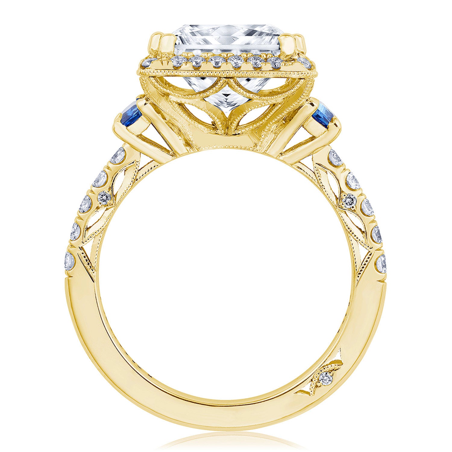 This elegant three-stone setting is exceptionally detailed. A Spotlight Bloom with blue sapphire Cadillac-cut side stones sit atop a meticulous French pavé band enhanced by the lace-like, Dantela Crescent Fabric.