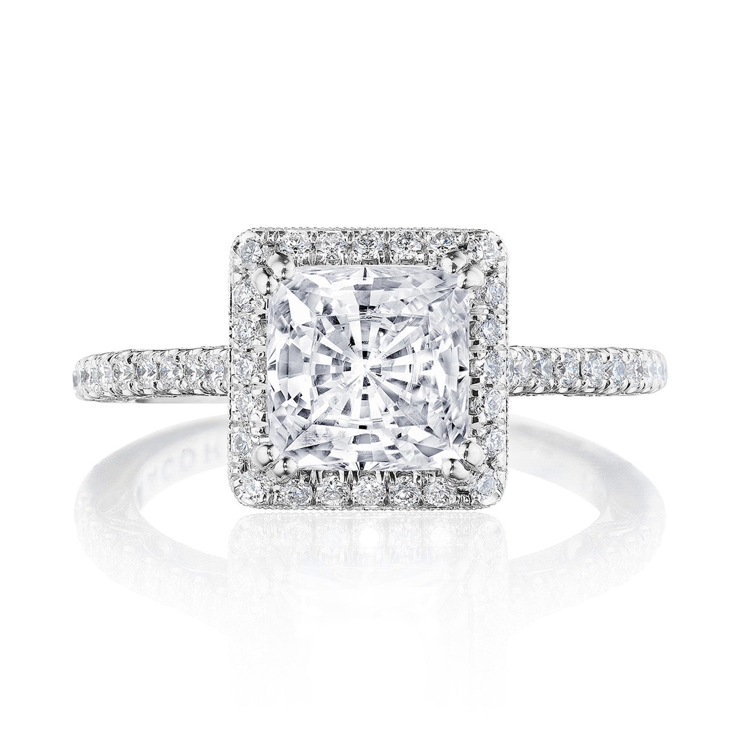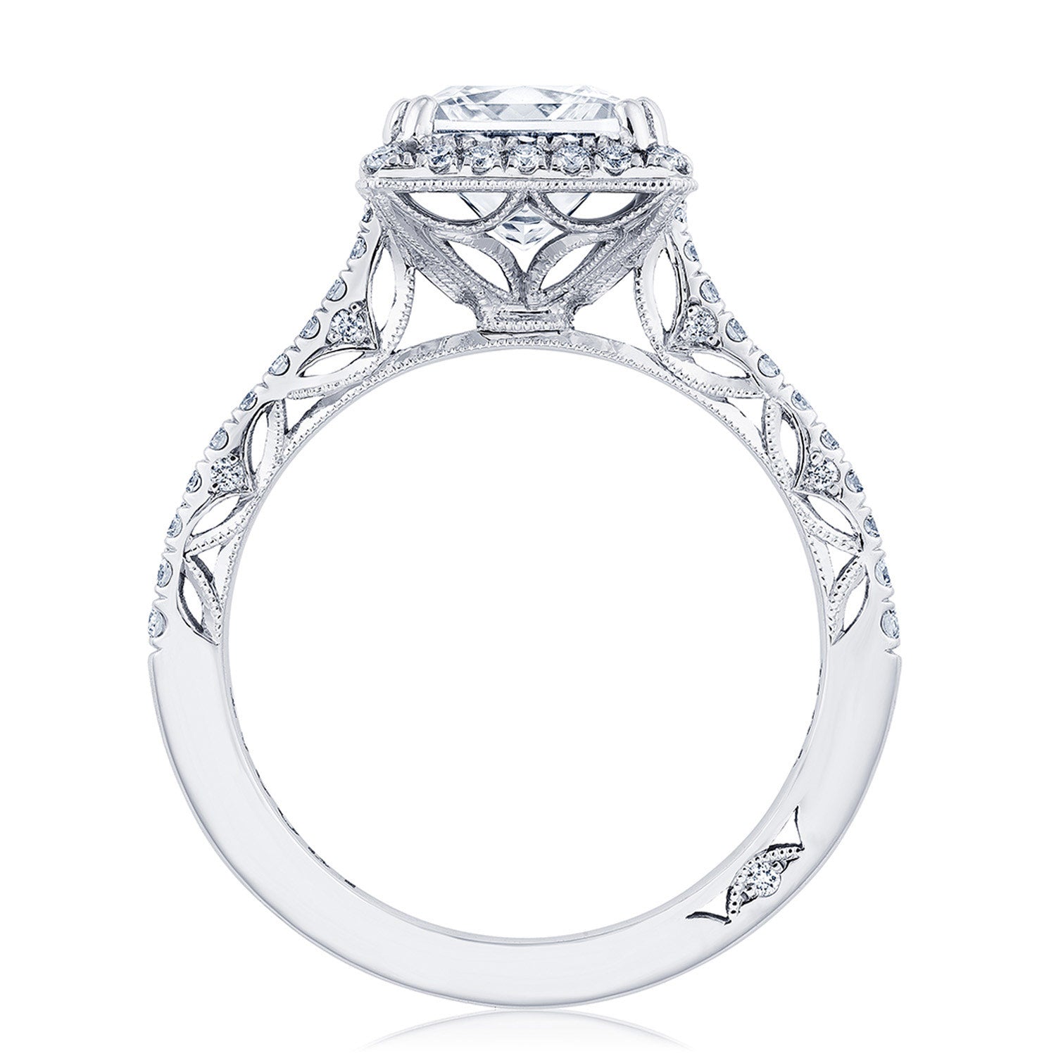 A subtle Spotlight Bloom encircles the center stone, and more brilliance is added by the meticulous French pavé that leads up the ceiling. A lace-like Crescent Fabric, edged with milgrain, gives stunning texture to the inner face profile.