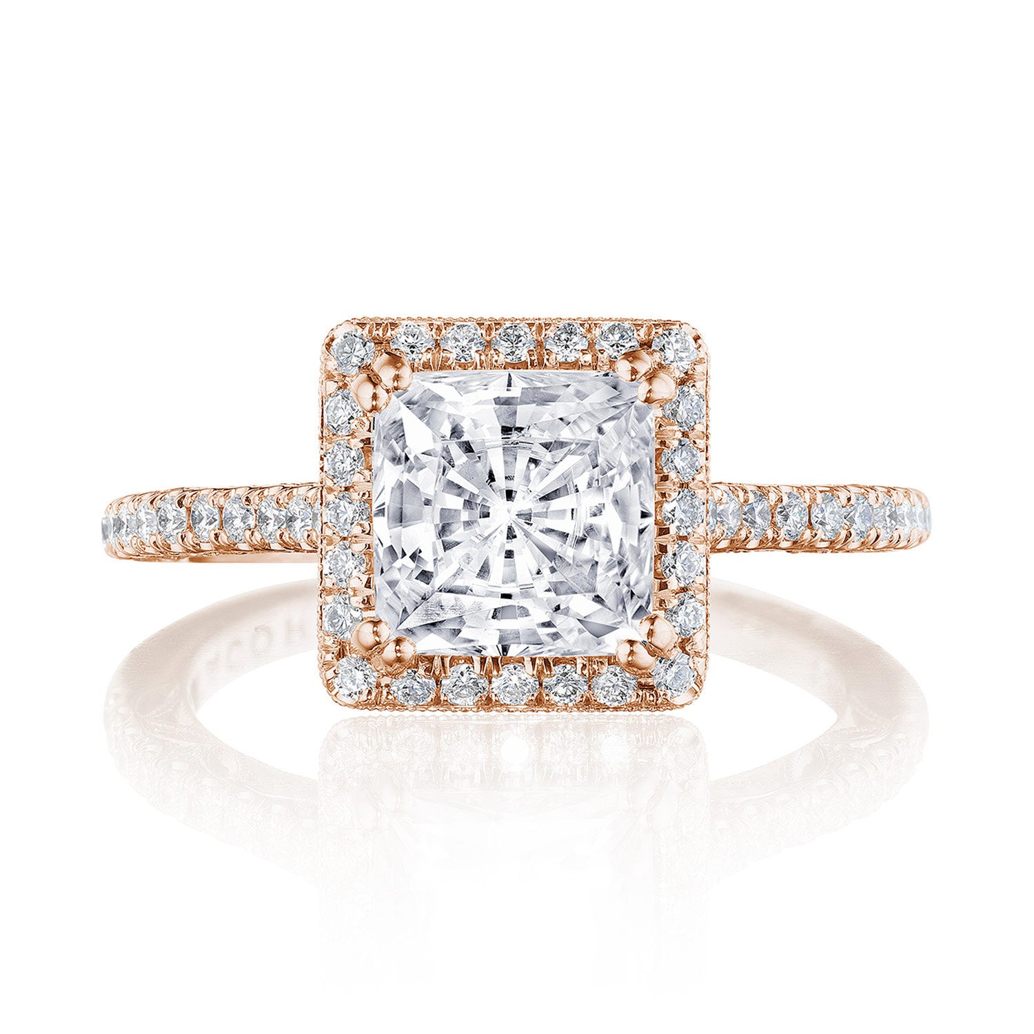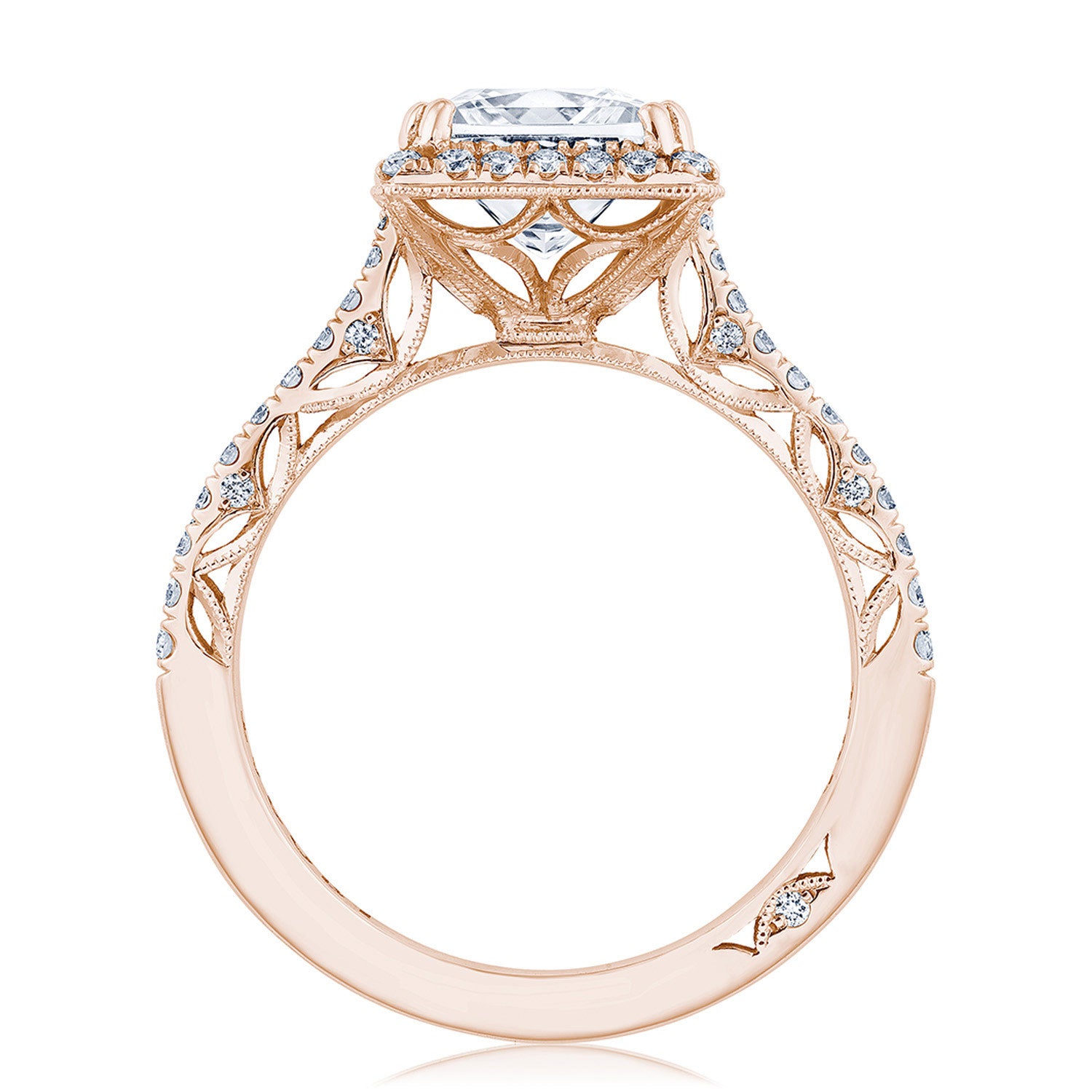 A subtle Spotlight Bloom encircles the center stone, and more brilliance is added by the meticulous French pavé that leads up the ceiling. A lace-like Crescent Fabric, edged with milgrain, gives stunning texture to the inner face profile.
