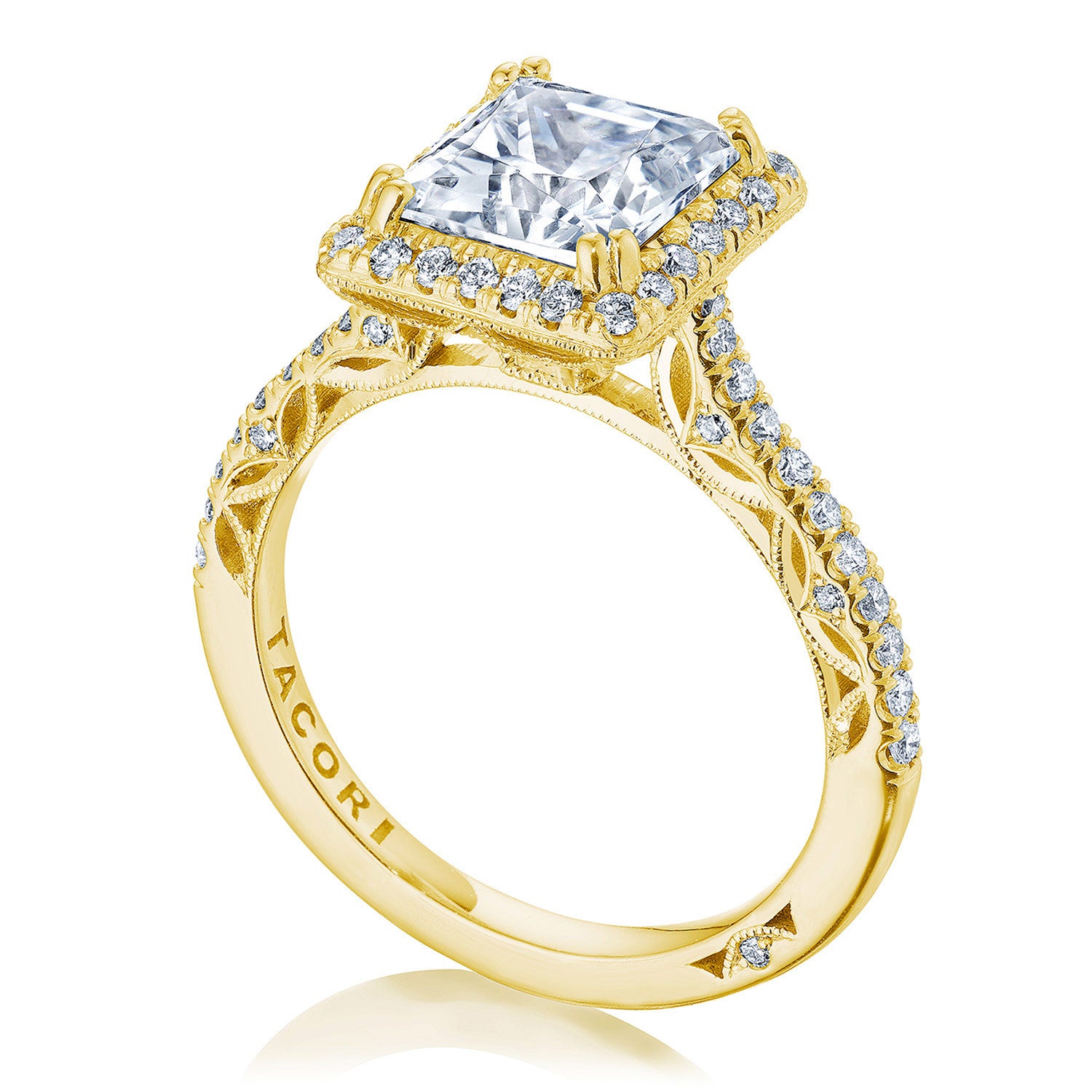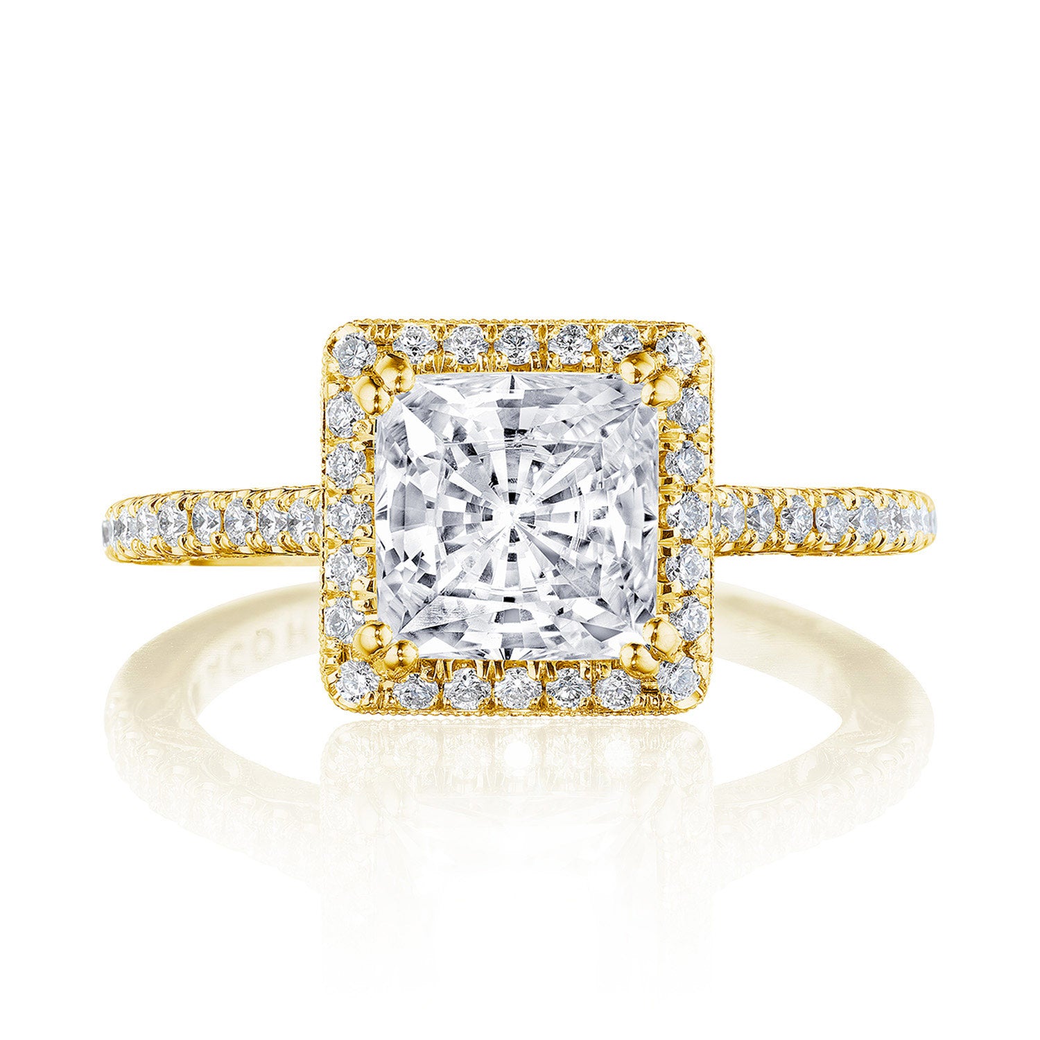A subtle Spotlight Bloom encircles the center stone, and more brilliance is added by the meticulous French pavé that leads up the ceiling. A lace-like Crescent Fabric, edged with milgrain, gives stunning texture to the inner face profile.