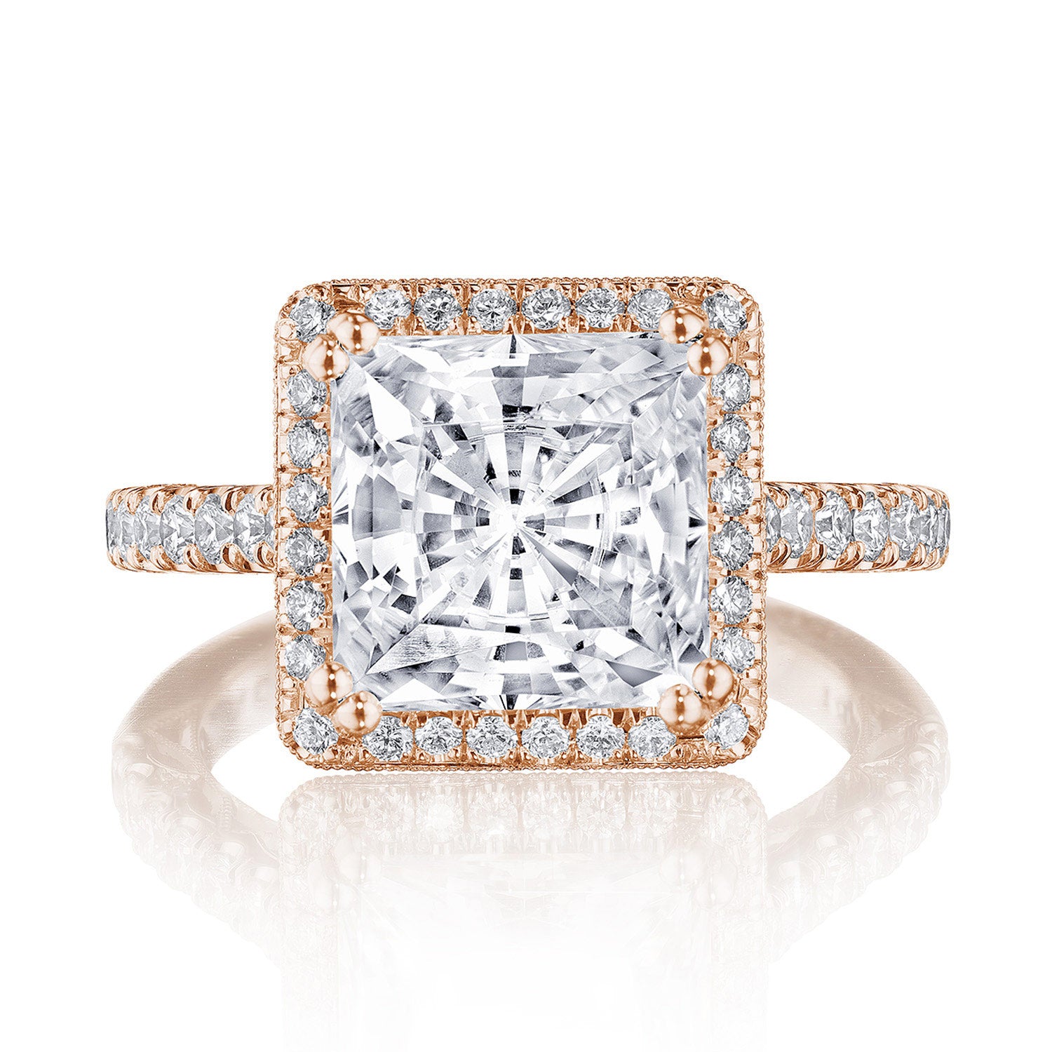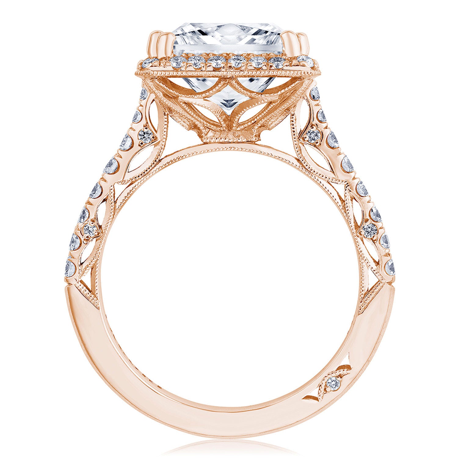 A subtle Spotlight Bloom encircles the center stone, and more brilliance is added by the meticulous French pavé that leads up the ceiling. A lace-like Crescent Fabric, edged with milgrain, gives stunning texture to the inner face profile.