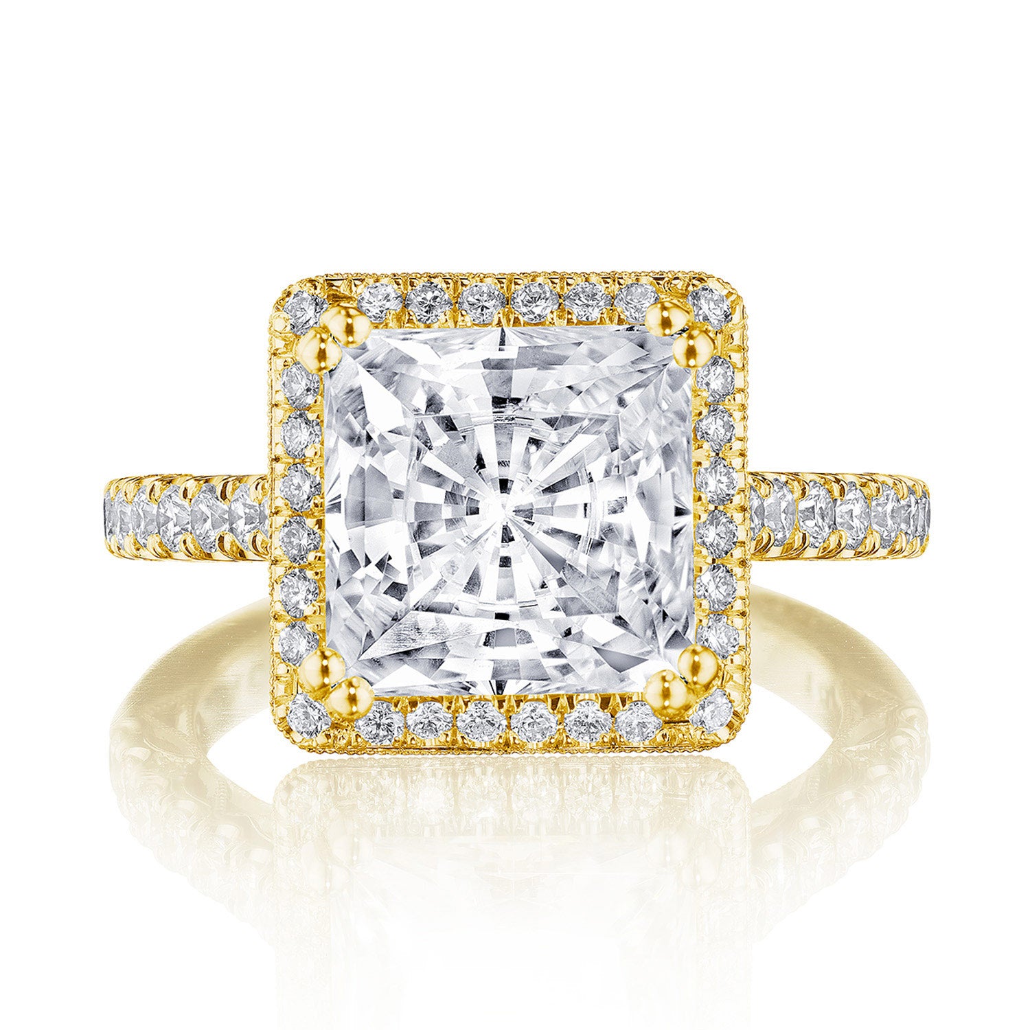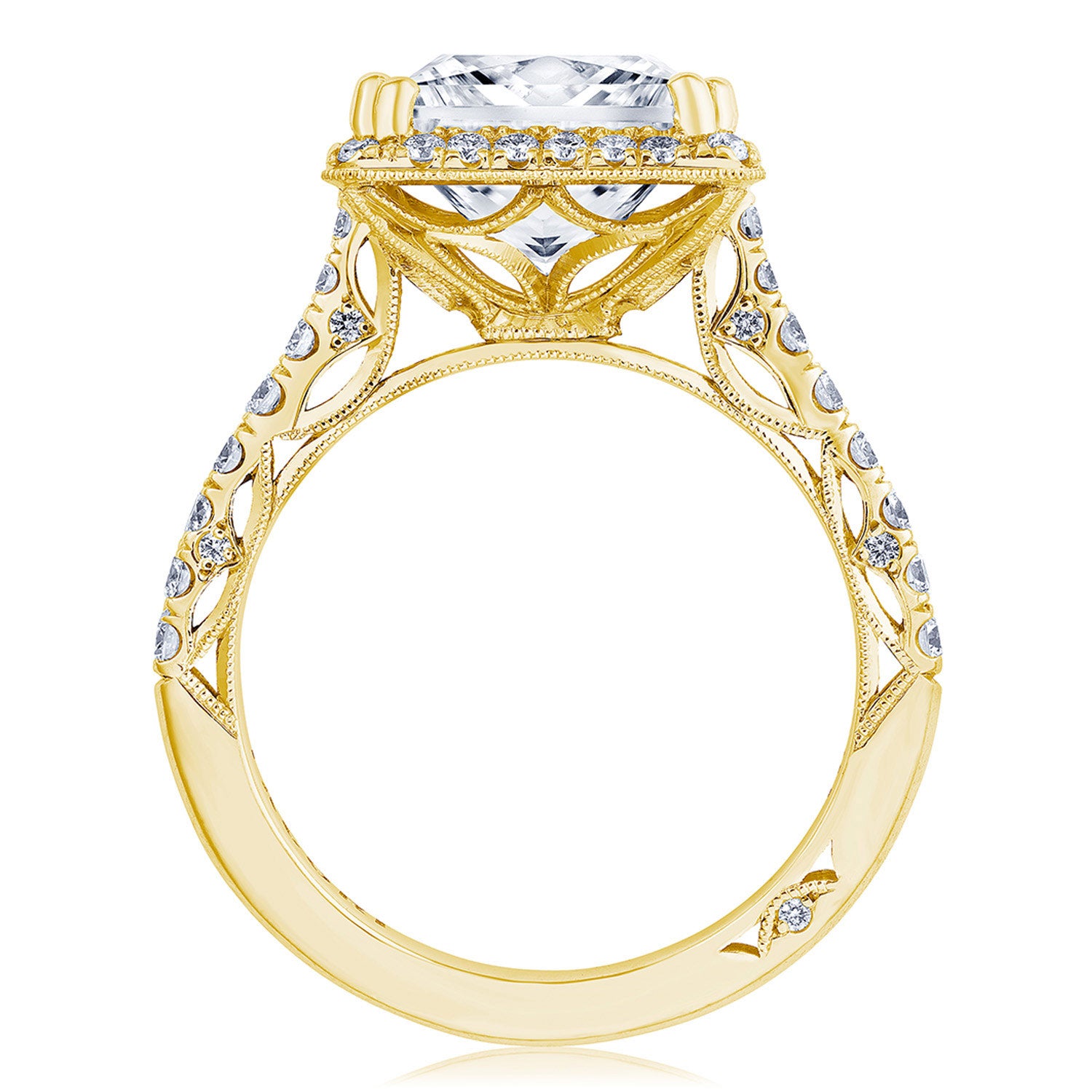 A subtle Spotlight Bloom encircles the center stone, and more brilliance is added by the meticulous French pavé that leads up the ceiling. A lace-like Crescent Fabric, edged with milgrain, gives stunning texture to the inner face profile.