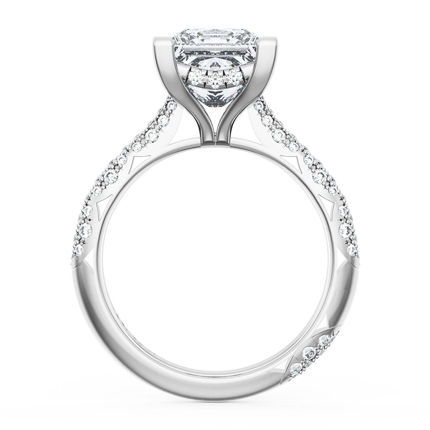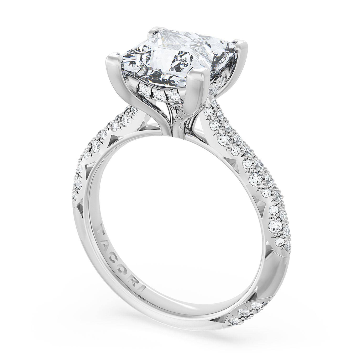 A cathedral foundation is accented with a hidden bloom of diamonds, while the Founder's Crescent Fabric wraps around the ceiling of the ring. The ring is finished with a diamond-studded Signature Crescent.