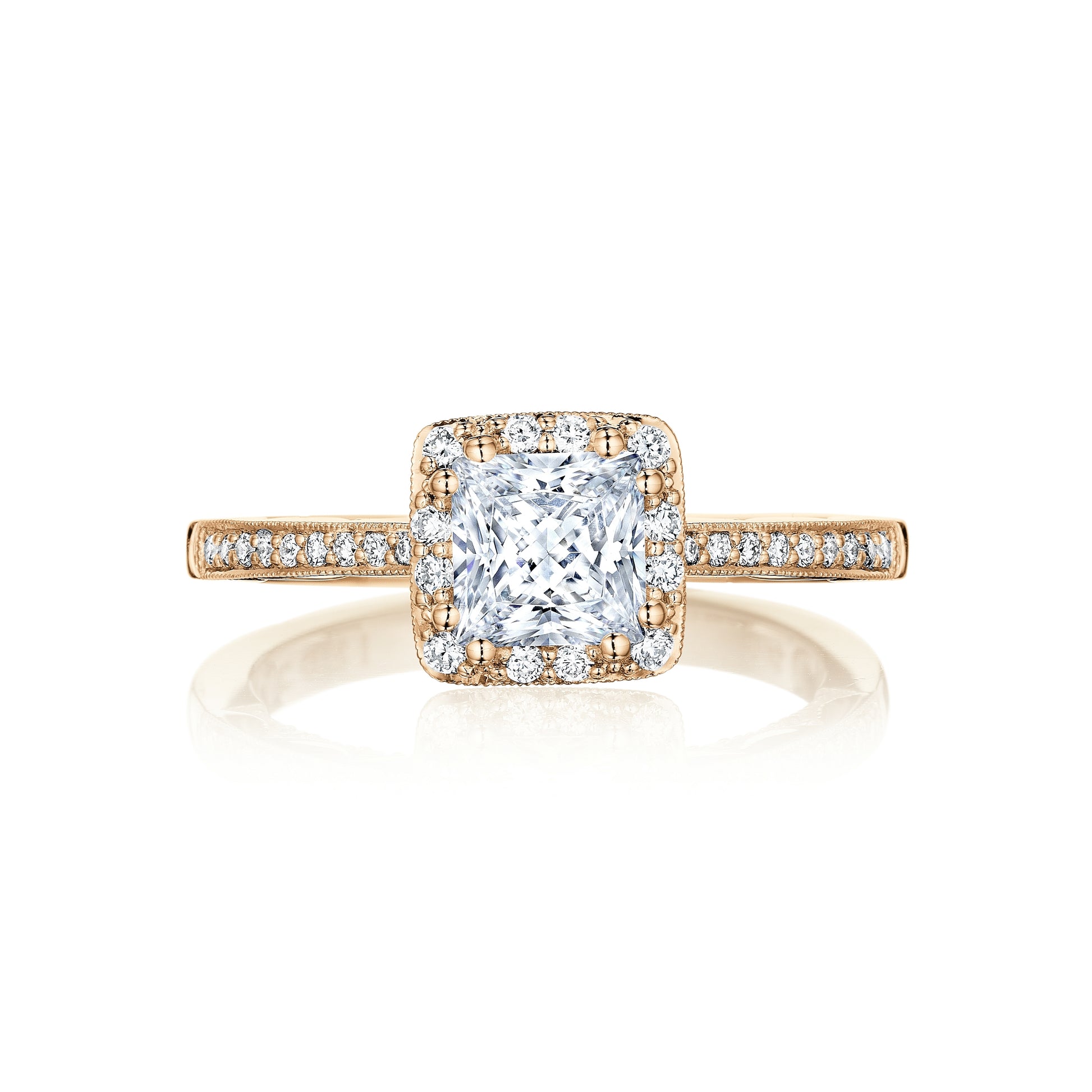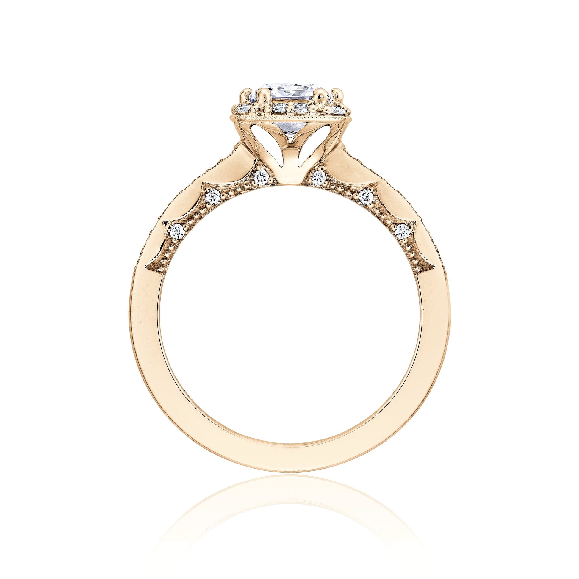 A princess cut diamond solitaire is brought to life by a crown of diamonds and rests gently on a diamond band. This ring features the Coastal Crescent inner face with pinpoint diamond details for a truly regal look.