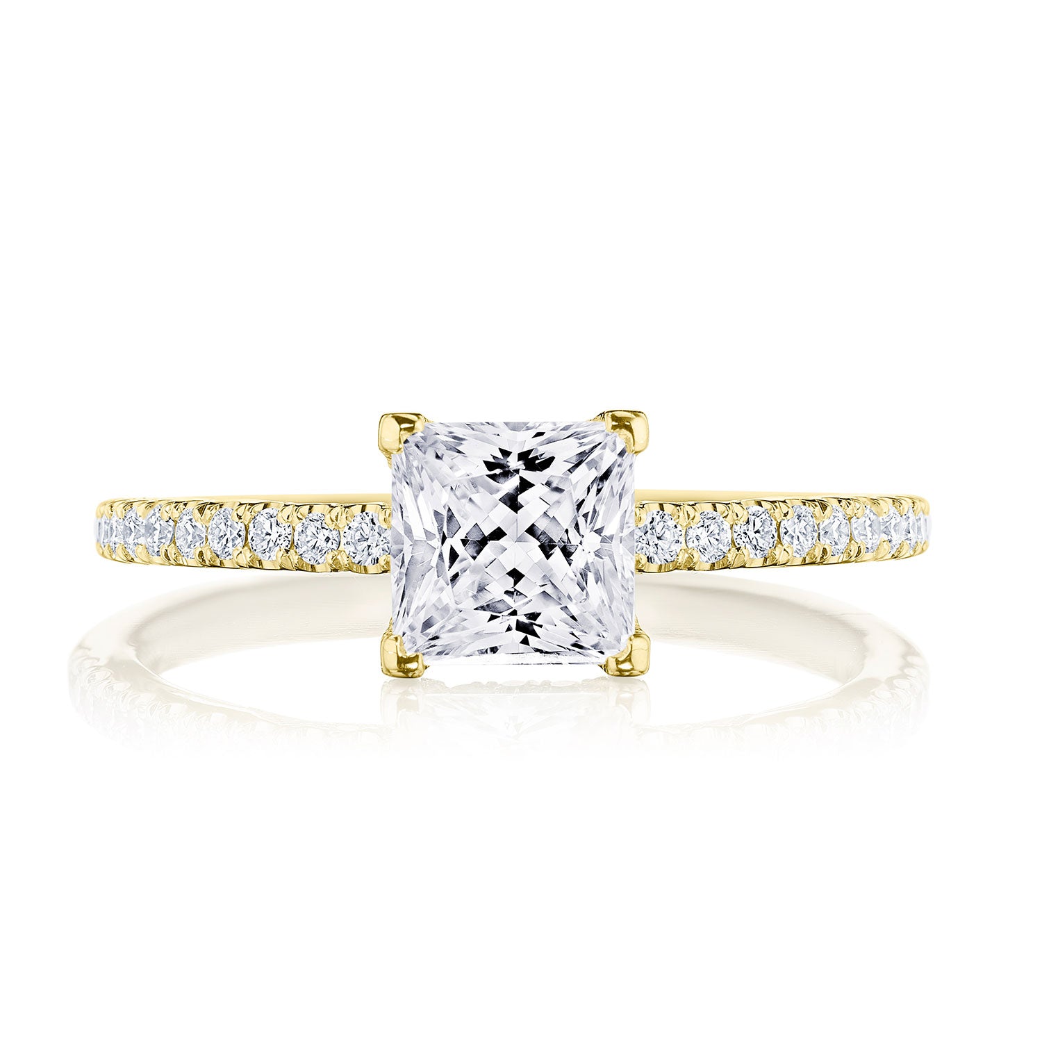 A bold solitaire diamond look with a thin band - this exceptional beauty will make you say I Do. Look for the secret detail diamond-inscribed T detail on the setting of the ring.