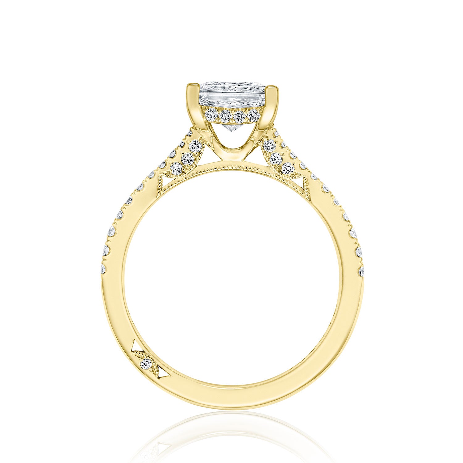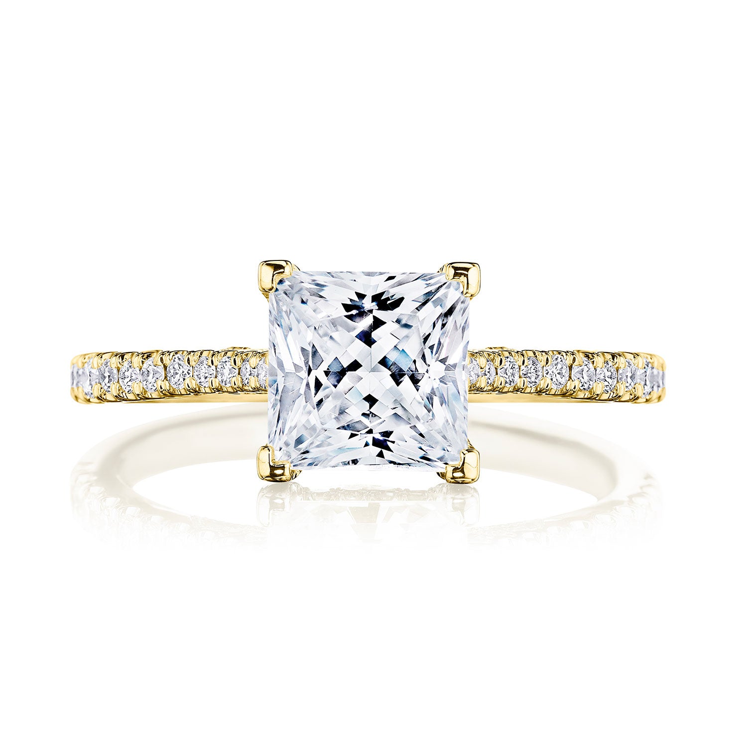 Strong solitaire look with a thin band that delivers brilliant detail- this Truly T varietal of Simply Tacori features a Cathedral foundation with French pavé set diamonds on the band and is perfect for the modern bride. Look for the secret diamond inscribed, “T” detail on the setting of the ring.