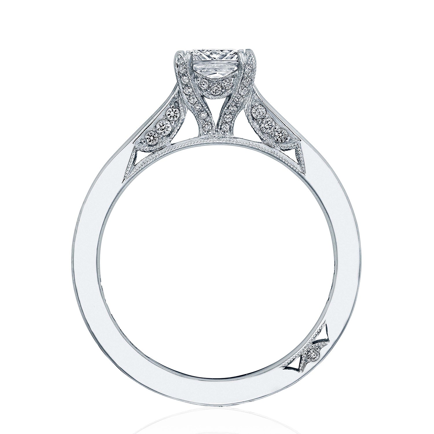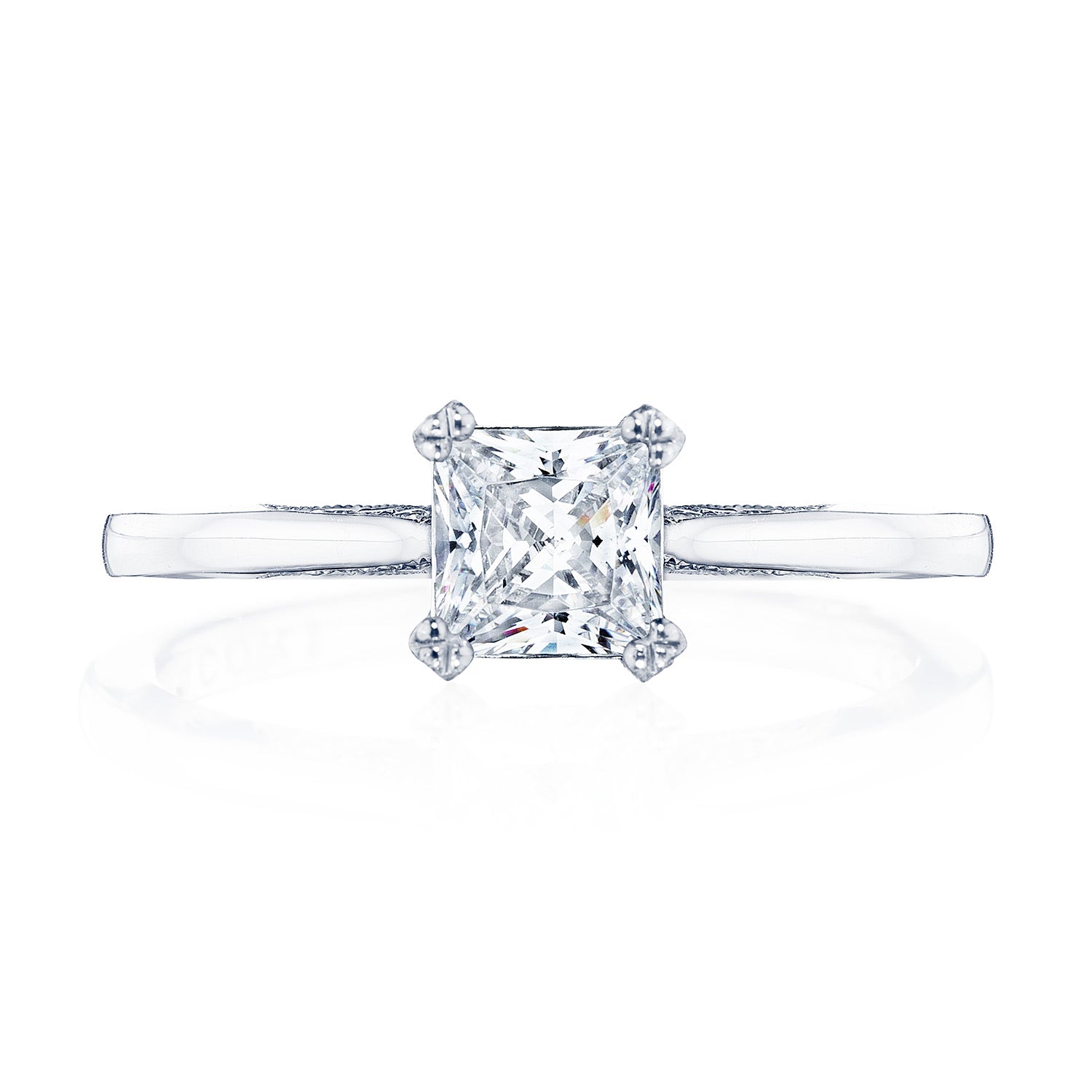 Delicate details and a dainty Cathedral foundation. This Simply Tacori solitaire features an effortlessly modern, hi-polish ceiling and princess cut center.