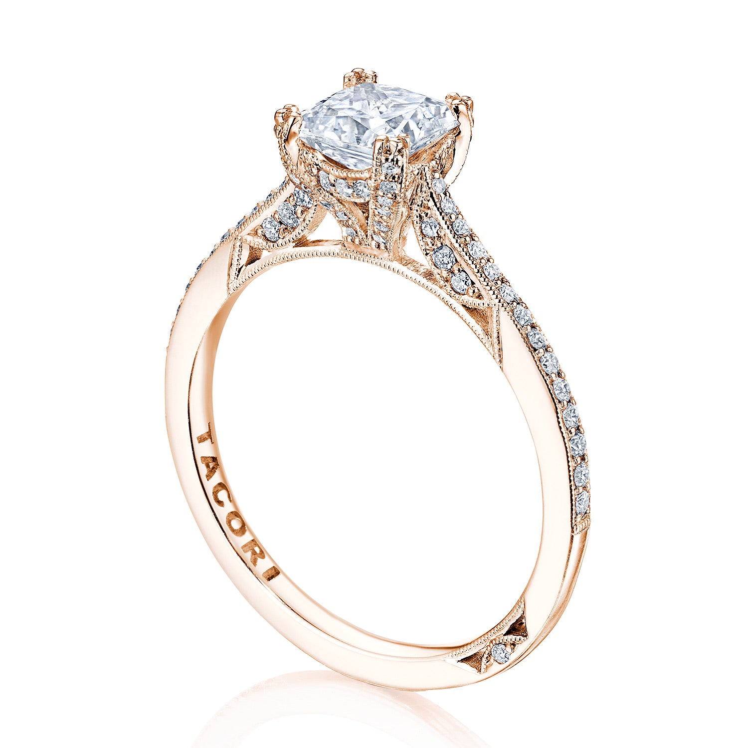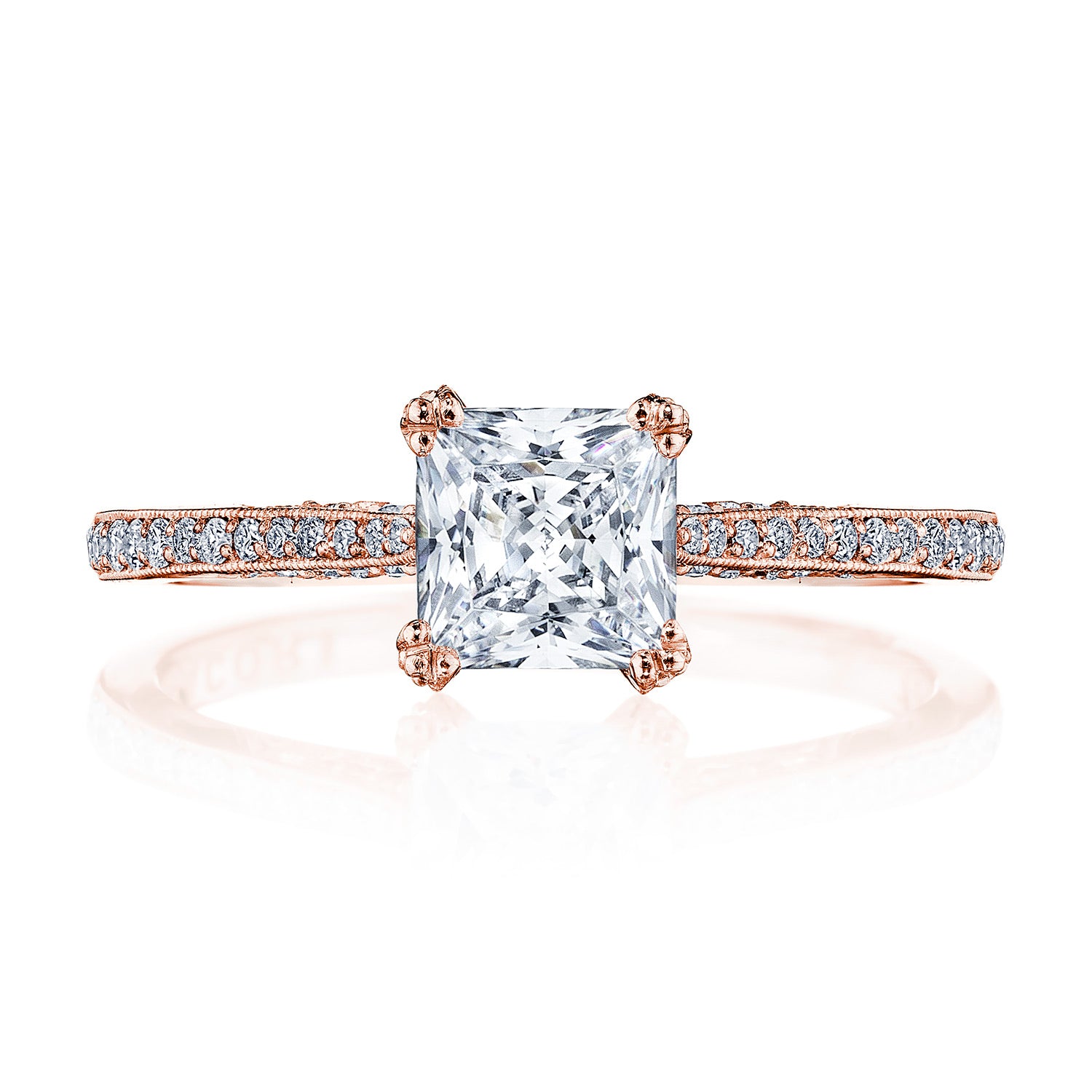 Delicate details and a dainty Cathedral foundation. This Simply Tacori solitaire features a high shine pavé diamond ceiling and princess cut center.