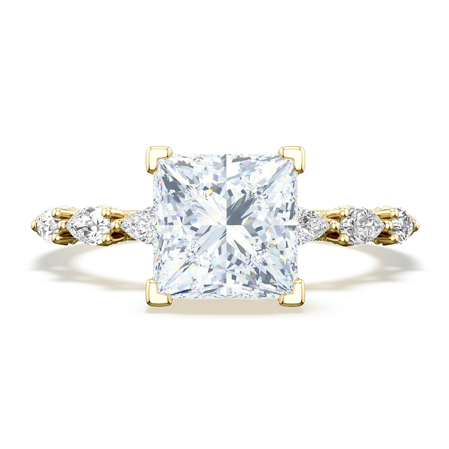 This intricately detailed engagement ring puts a spotlight on pear-shaped diamonds. Diamond accents and beading enhance an elegant crown with hidden bloom detail and a Sculpted Crescent inner face with crescent signature at the resting point.