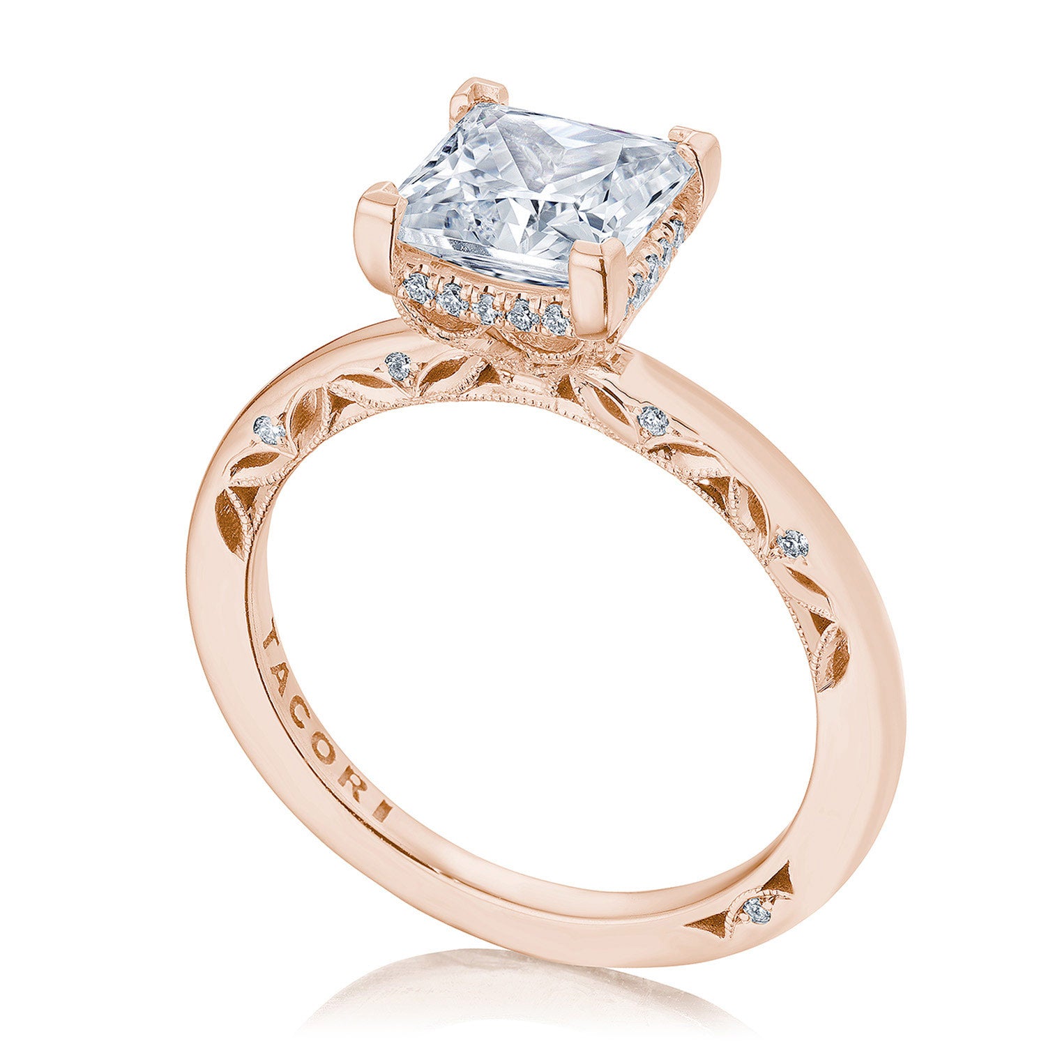 A high-polish ceiling accented with lace-like tracery makes for a stunningly airy setting. The hand-hewn milgrain and pinpoint diamonds add nuance, while a hidden bloom creates dimensional light. A Signature Crescent marks the resting point.