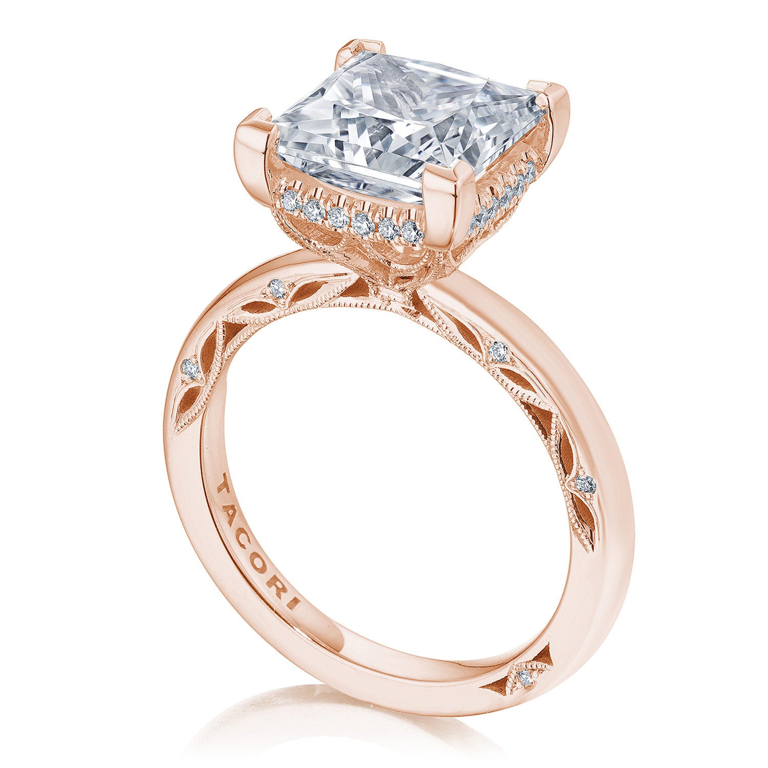 A high-polish ceiling accented with lace-like tracery makes for a stunningly airy setting. The hand-hewn milgrain and pinpoint diamonds add nuance, while a hidden bloom creates dimensional light. A Signature Crescent marks the resting point.