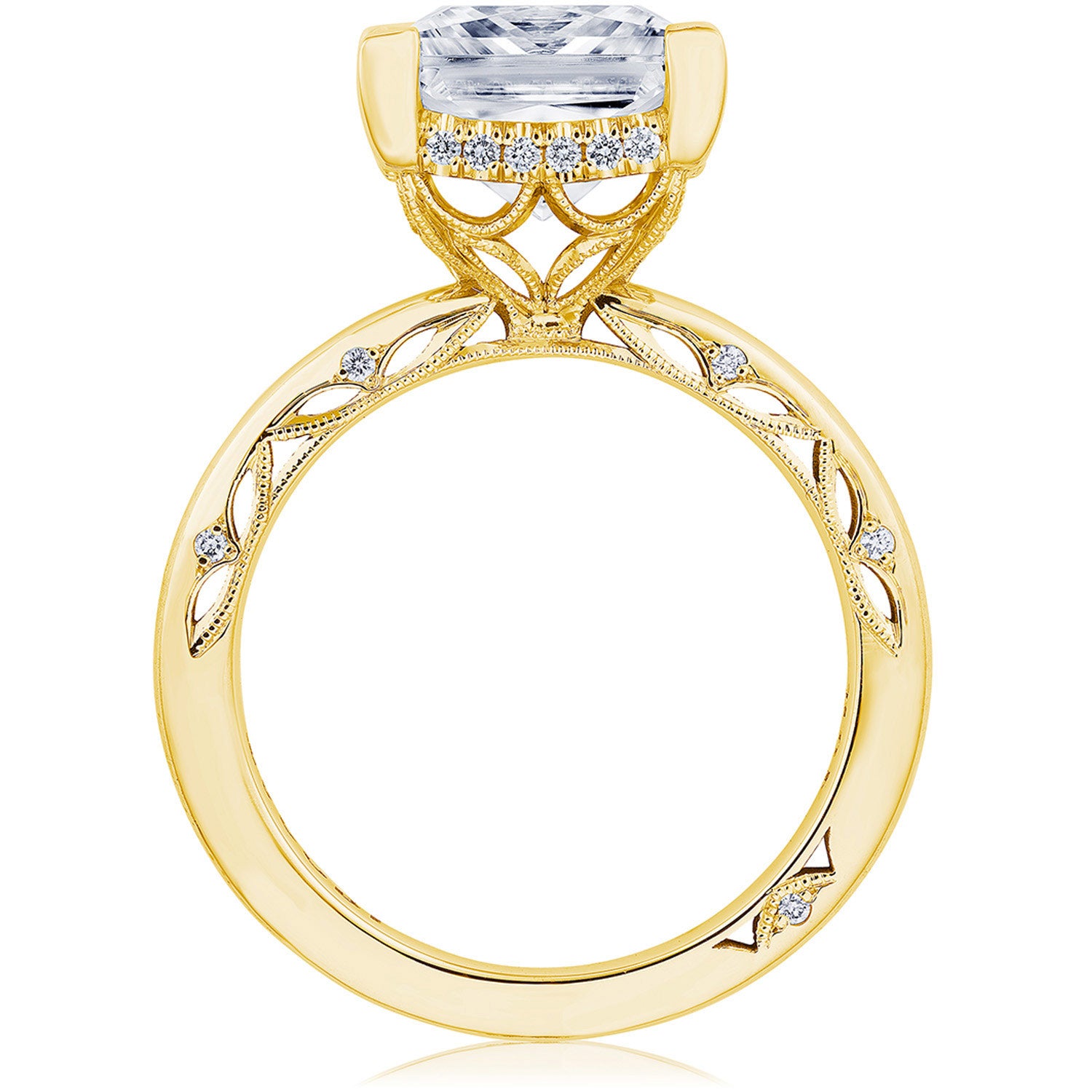 A high-polish ceiling accented with lace-like tracery makes for a stunningly airy setting. The hand-hewn milgrain and pinpoint diamonds add nuance, while a hidden bloom creates dimensional light. A Signature Crescent marks the resting point.