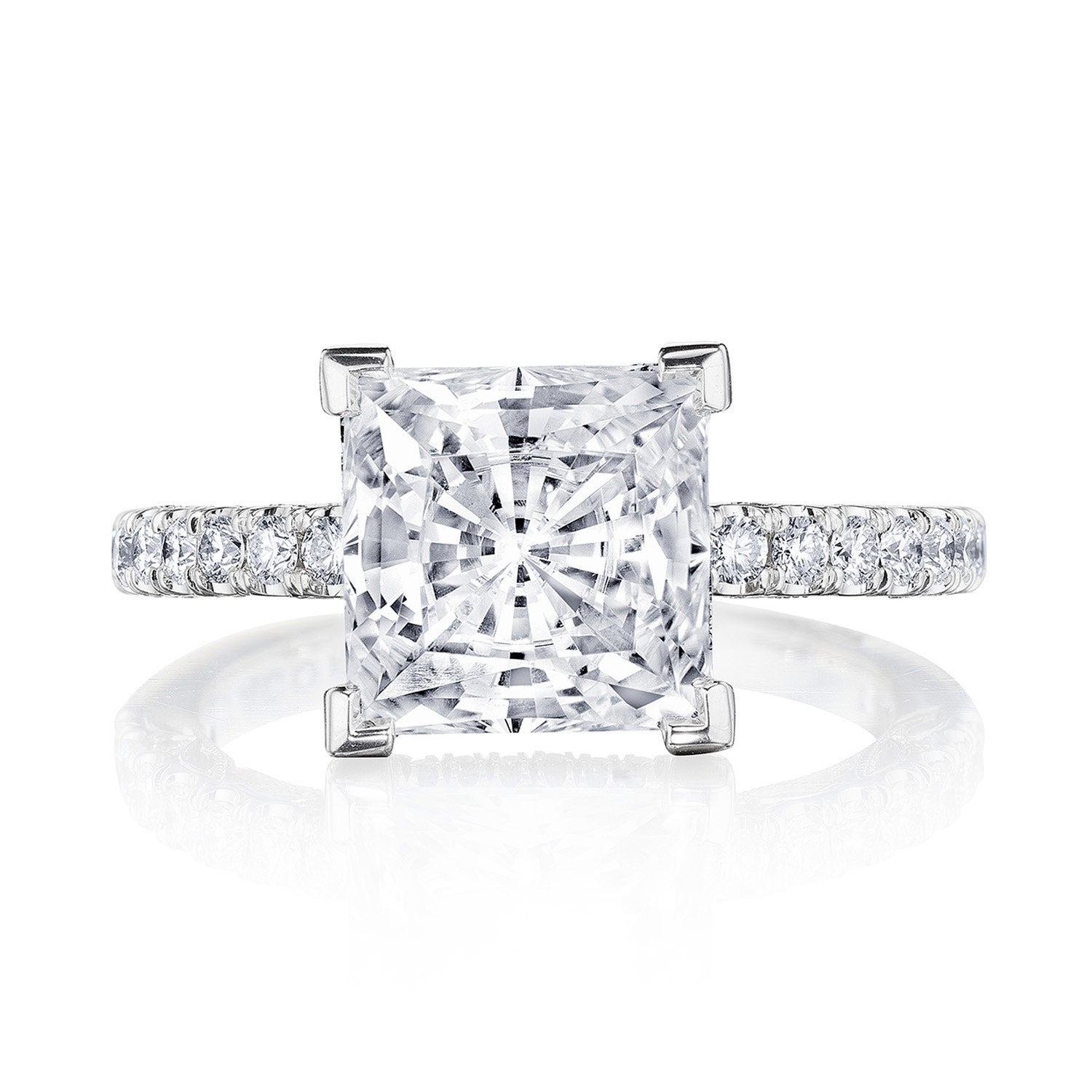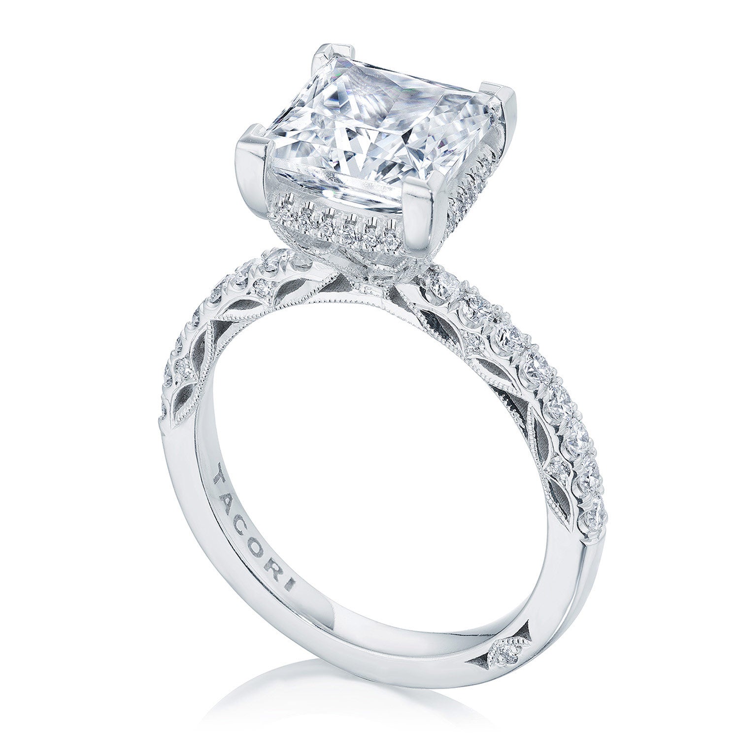 A French pavé ceiling adds dimensional light, while a hidden bloom and open air crown work illuminates the center stone. A complex and alluring lace-like Crescent Fabric gives stunning texture to the inner face profile.