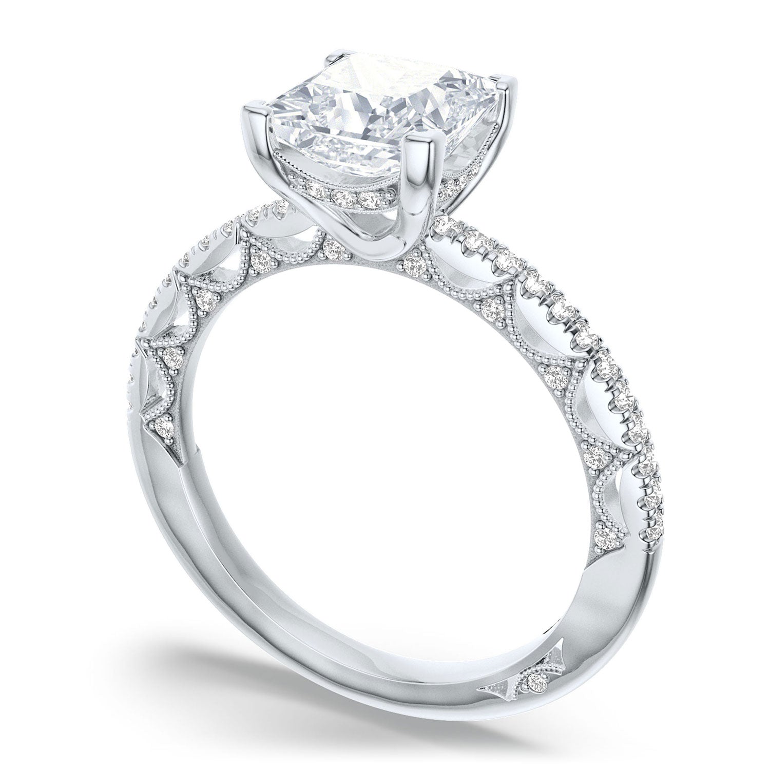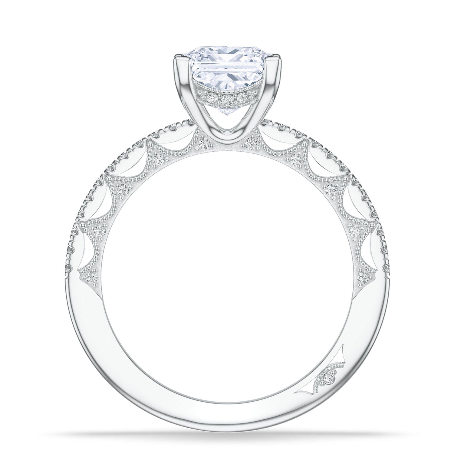 Milgrain-edged Crescents glow across the inner face, while round-brilliant diamonds, hand-set with triple beading, add radiance. A pave ceiling traces towards the center stone, which floats above a hidden bloom on a Classic 360 foundation.