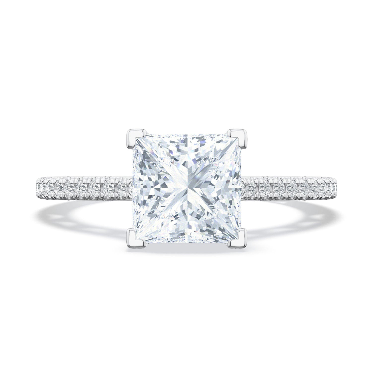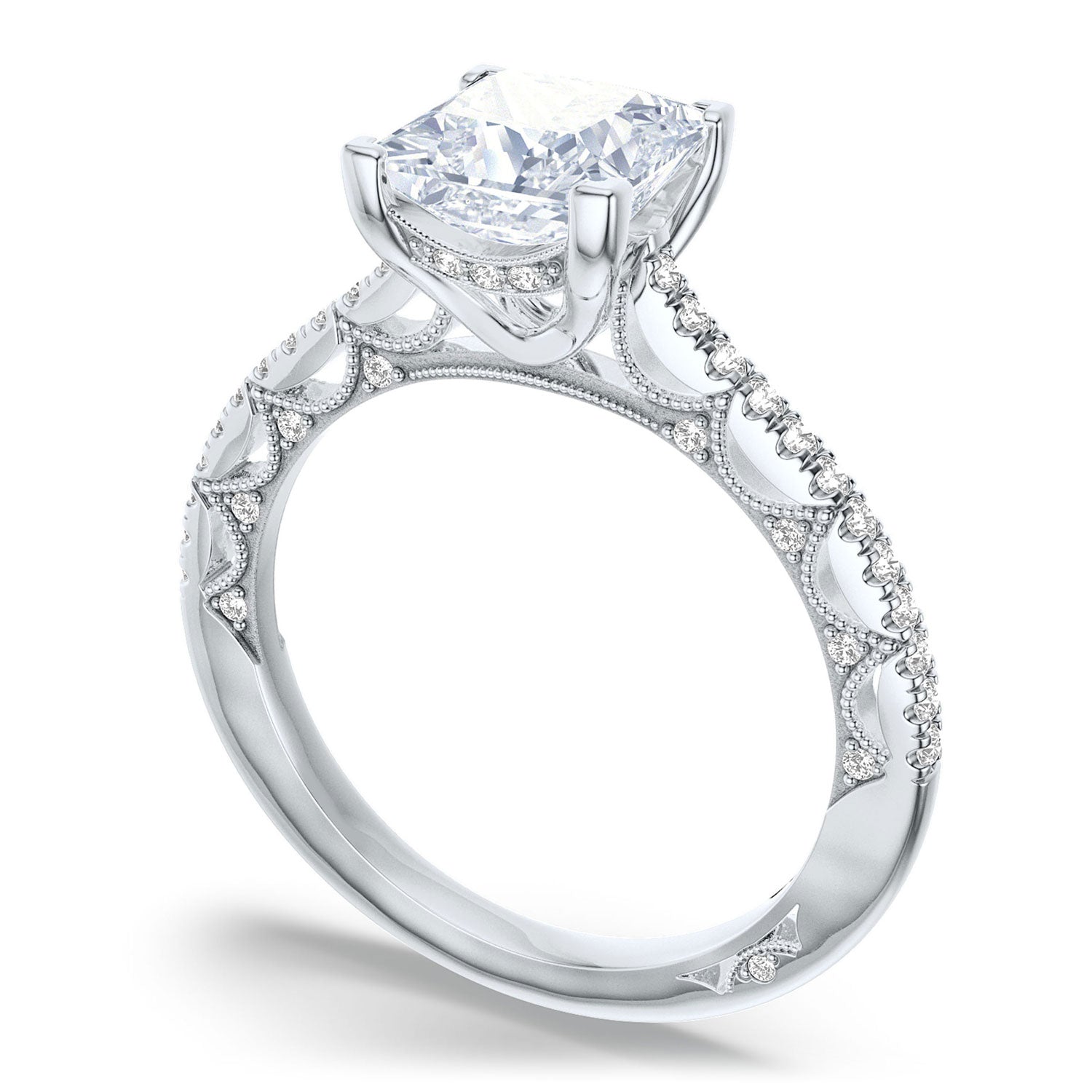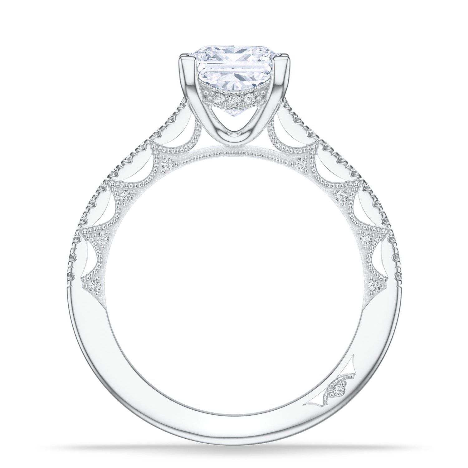 Milgrain-edged Crescents glow across the inner face, while round-brilliant diamonds, hand-set with triple beading, add radiance. A pave ceiling traces towards the center stone, which sits above a hidden bloom on a Cathedral foundation.