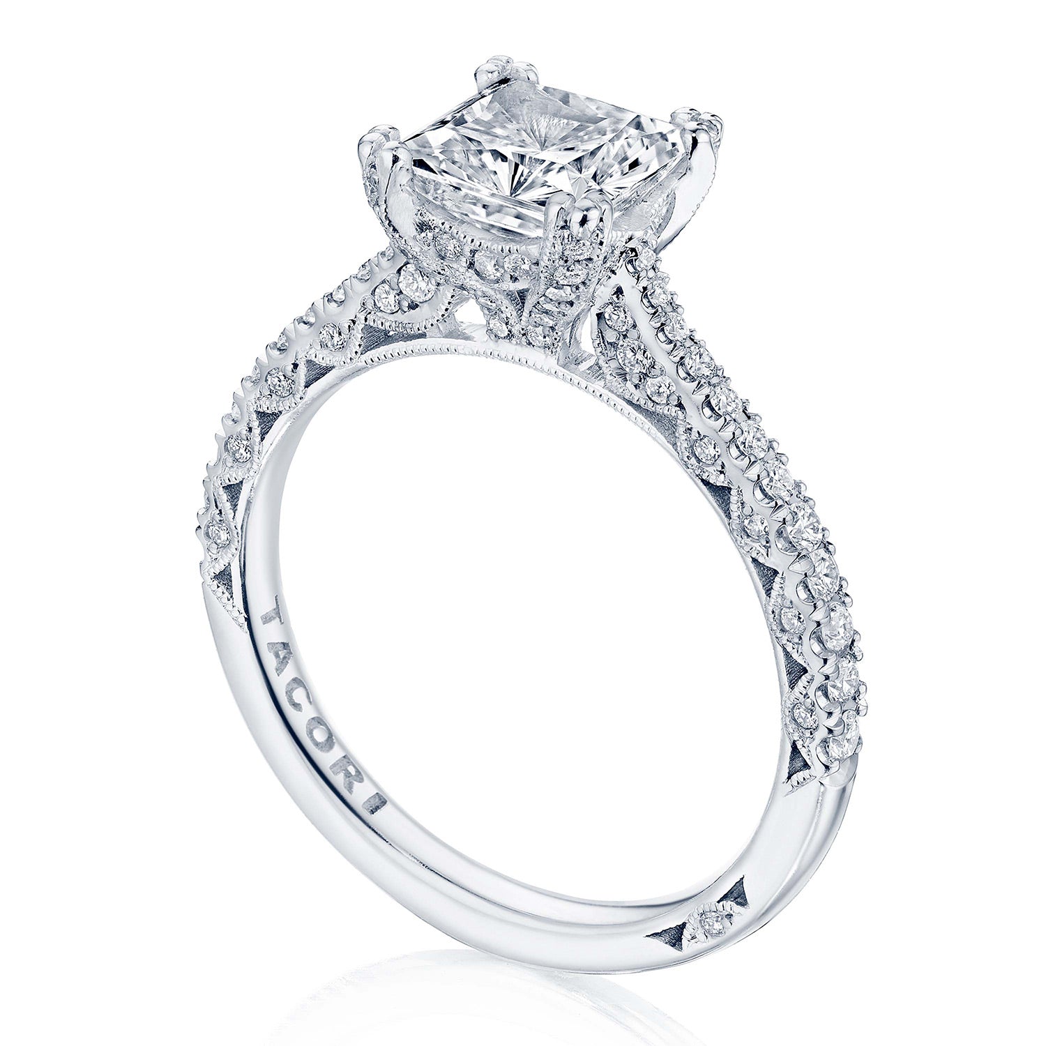 Pave-set diamonds are tapered along the ceiling, leading to a center solitaire set with diamond-studded prongs of a Cathedral foundation. A hidden bloom adds sparkle beneath the crown, and Petite Crescent decorates the innerface.