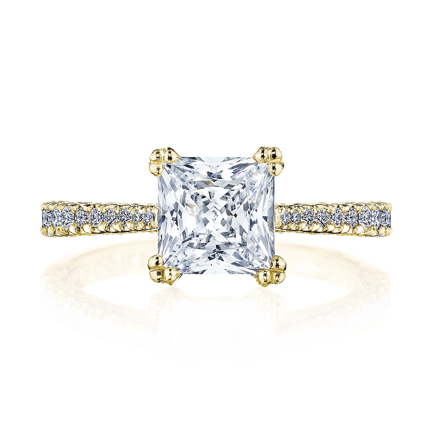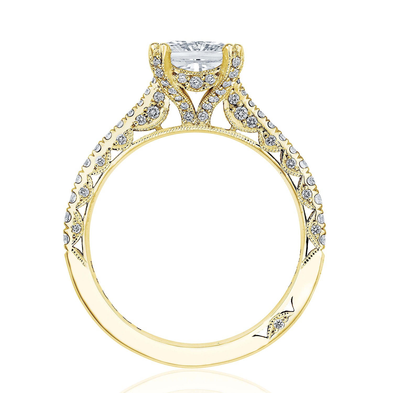 Pave-set diamonds are tapered along the ceiling, leading to a center solitaire set with diamond-studded prongs of a Cathedral foundation. A hidden bloom adds sparkle beneath the crown, and Petite Crescent decorates the innerface.