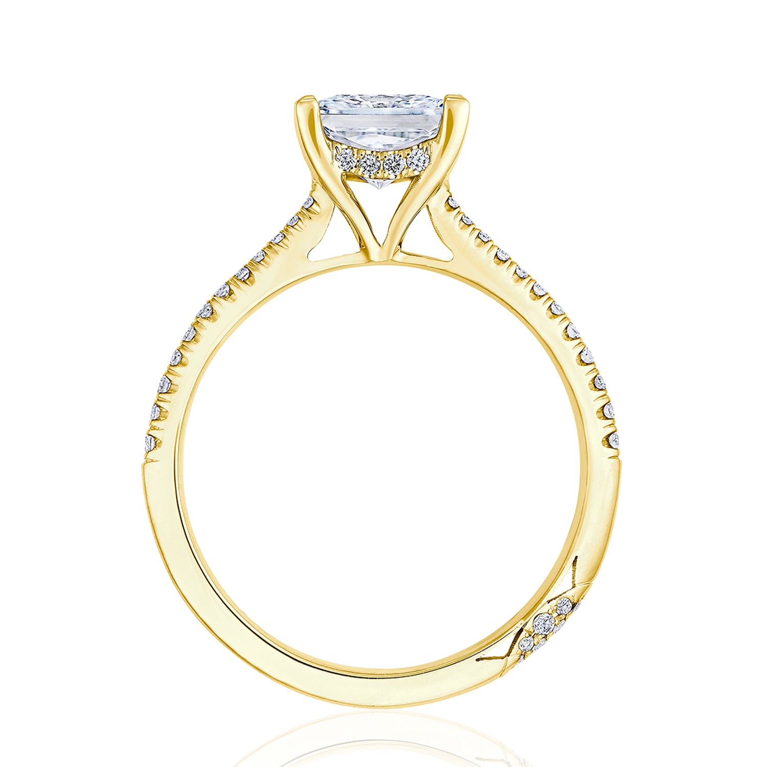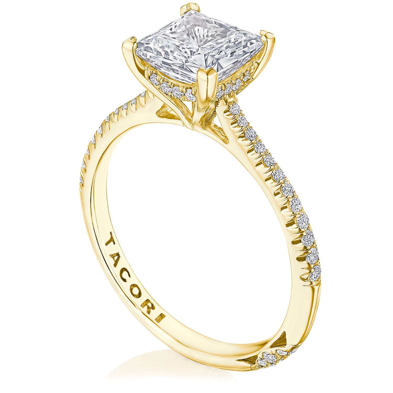 Designed by our Founder, Haig Tacorian, this stunning four-prong, solitaire engagement ring features a princess-cut center stone on a French-pavé set diamond band. Discover the hidden bloom of diamonds underneath the crown and the diamond-studded crescent signature at the foundation.