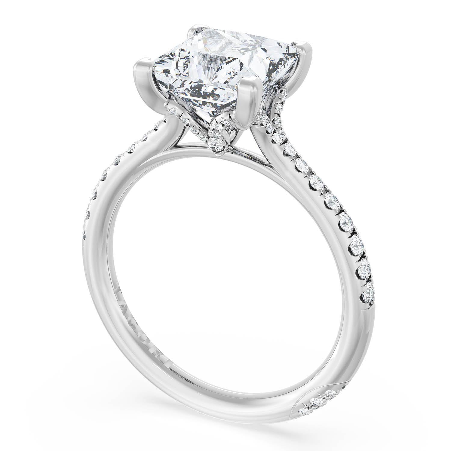 A Princess Solitaire is set into a unique corset-inspired crown on a 18kt White Gold foundation. Pavé-set diamonds decorate the ceiling and a diamond-studded Founder's Crescent marks the resting point.