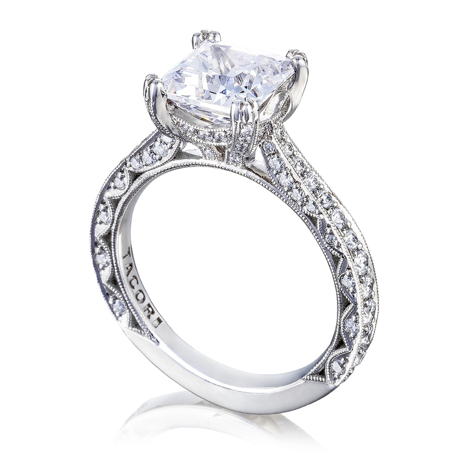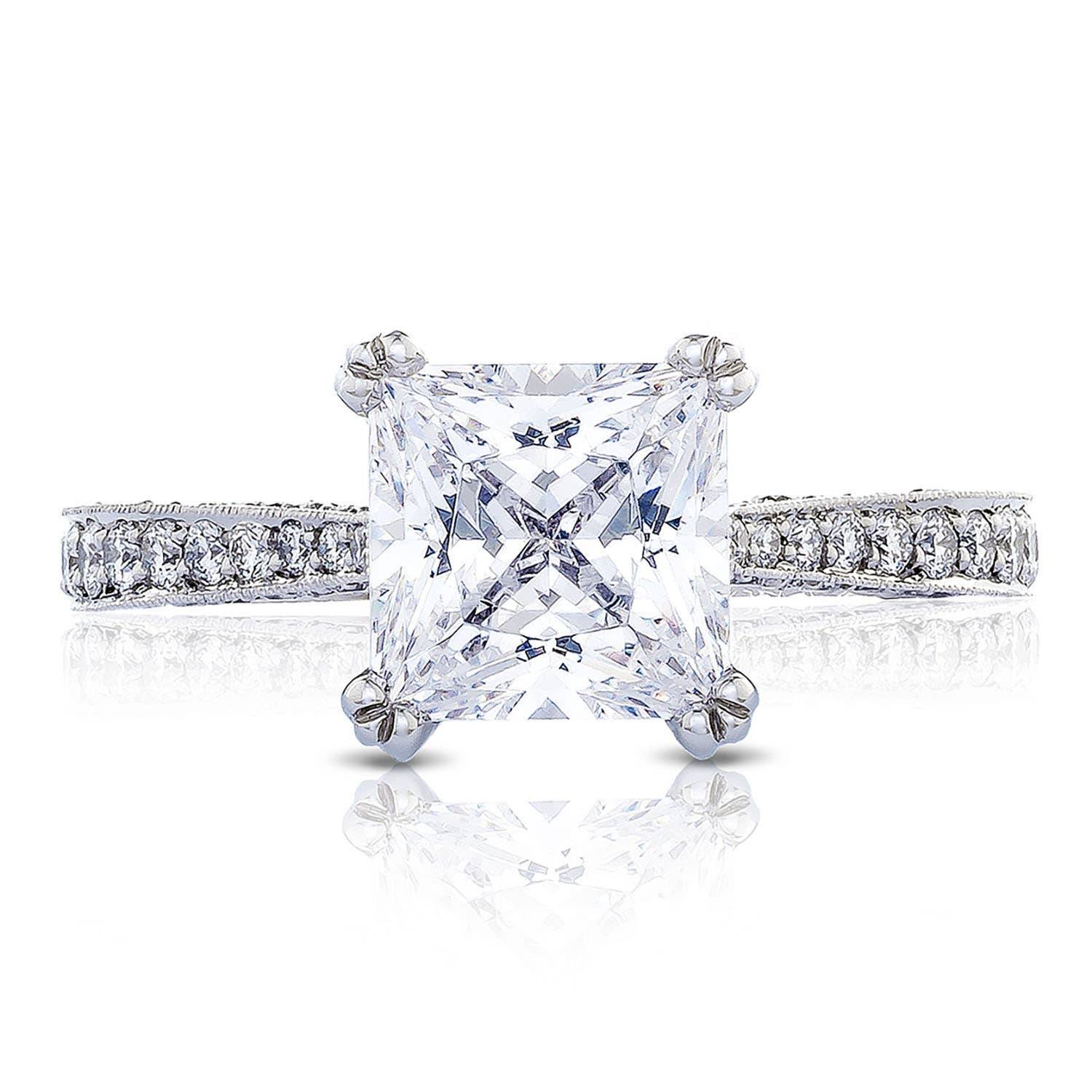 All eyes will be on your center diamond, in this not so simple solitaire princess cut diamond engagement ring. A sleek band with pavé set diamonds brings your brilliant princess cut diamond to life, making it worthy of your love.