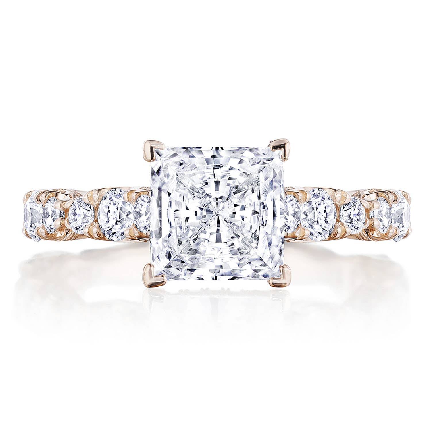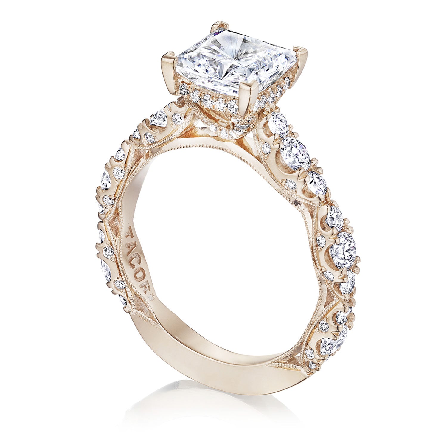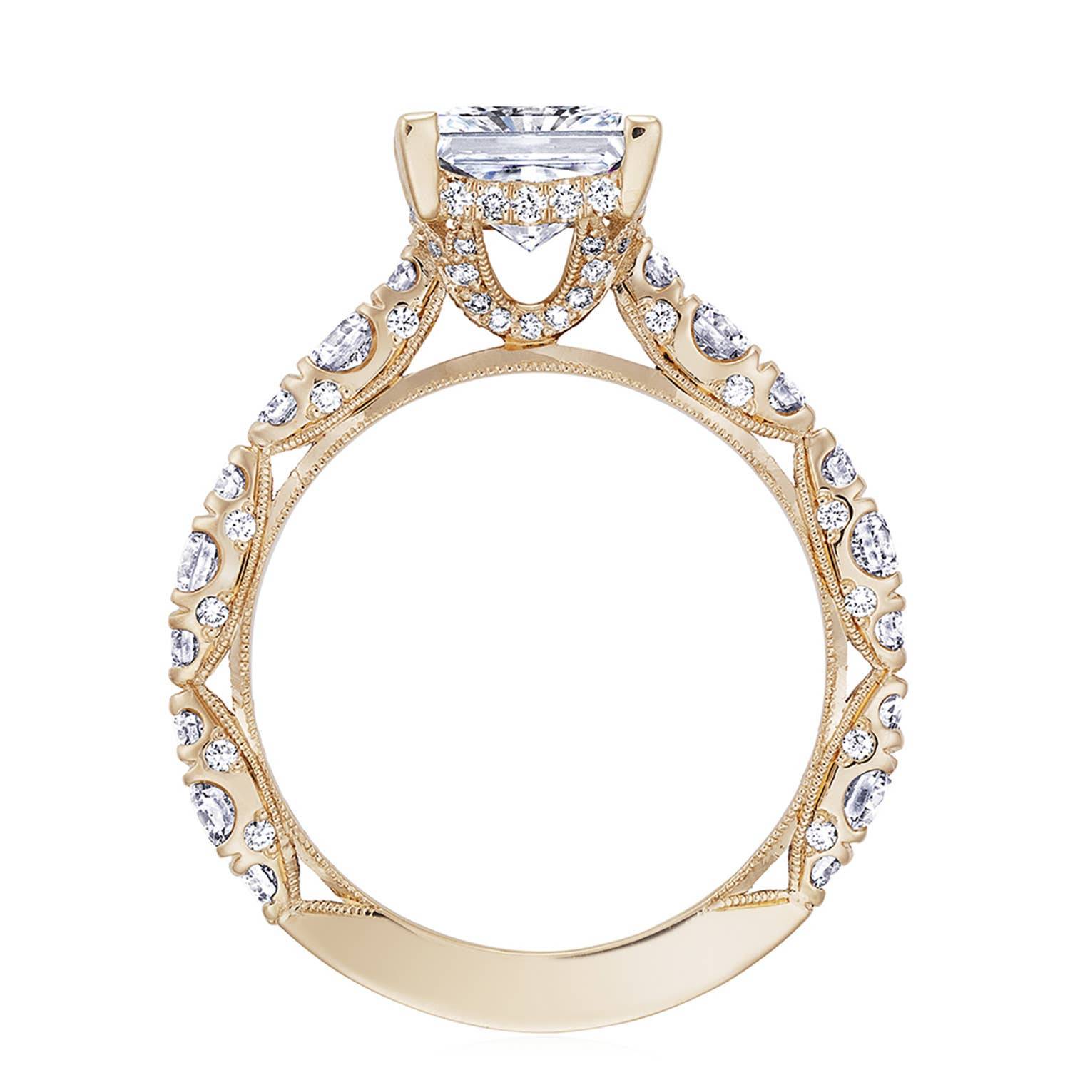 Beautiful marquise shapes with brilliant graduating diamonds dance along this stunning princess cut diamond engagement ring. Discover the hidden crescent diamond underlay that acts as a pedestal of diamonds to spotlight the center diamond.