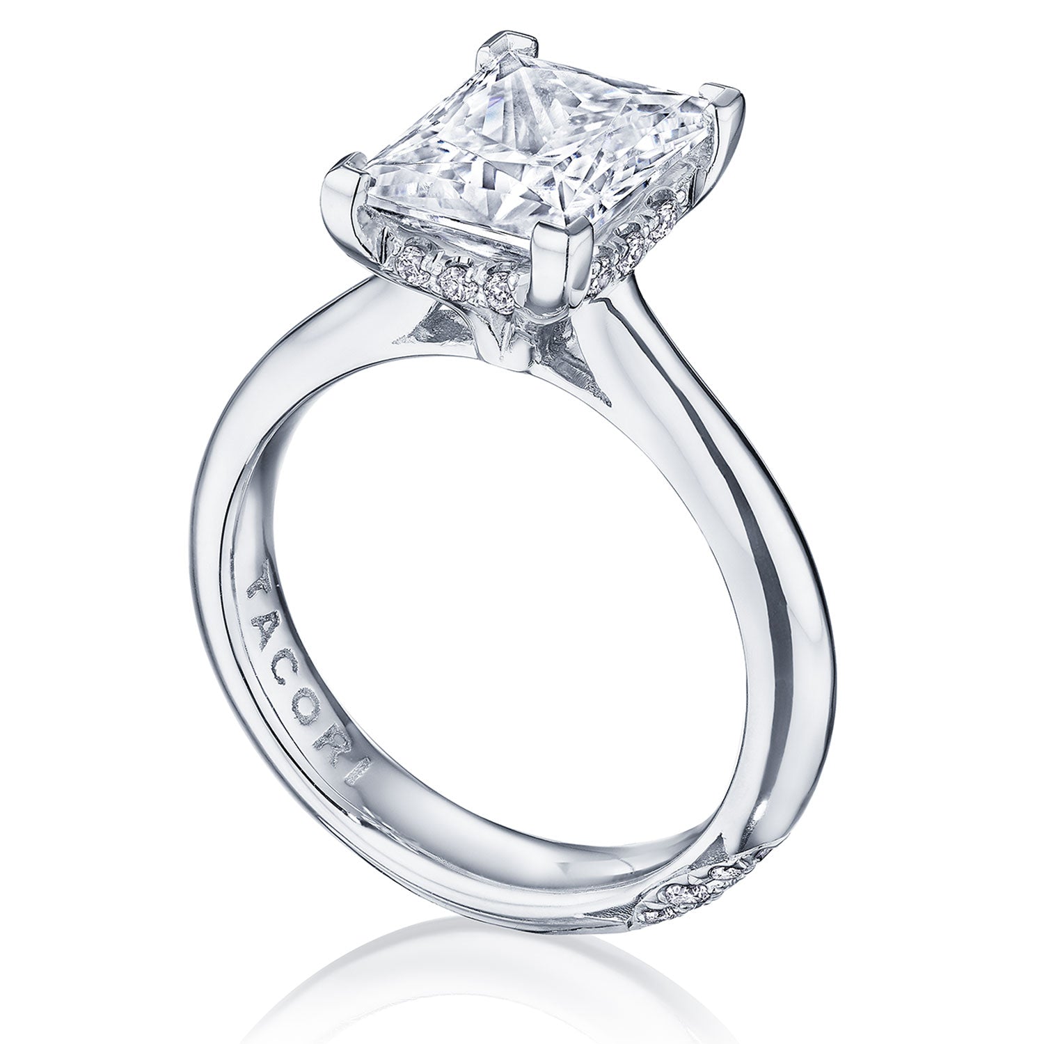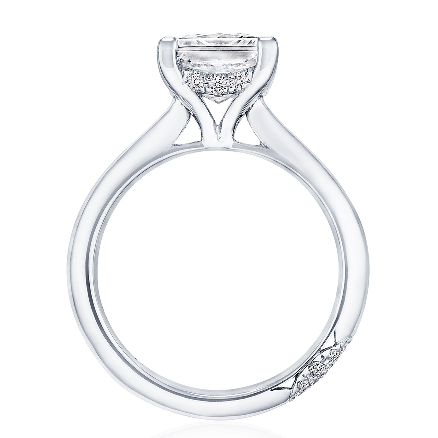 Designed by our Founder, Haig Tacorian, this stunning four-prong, solitaire engagement ring features a princess-cut center stone on a high-polished band. Discover the hidden bloom of diamonds underneath the crown and the diamond-studded crescent signature at the foundation.