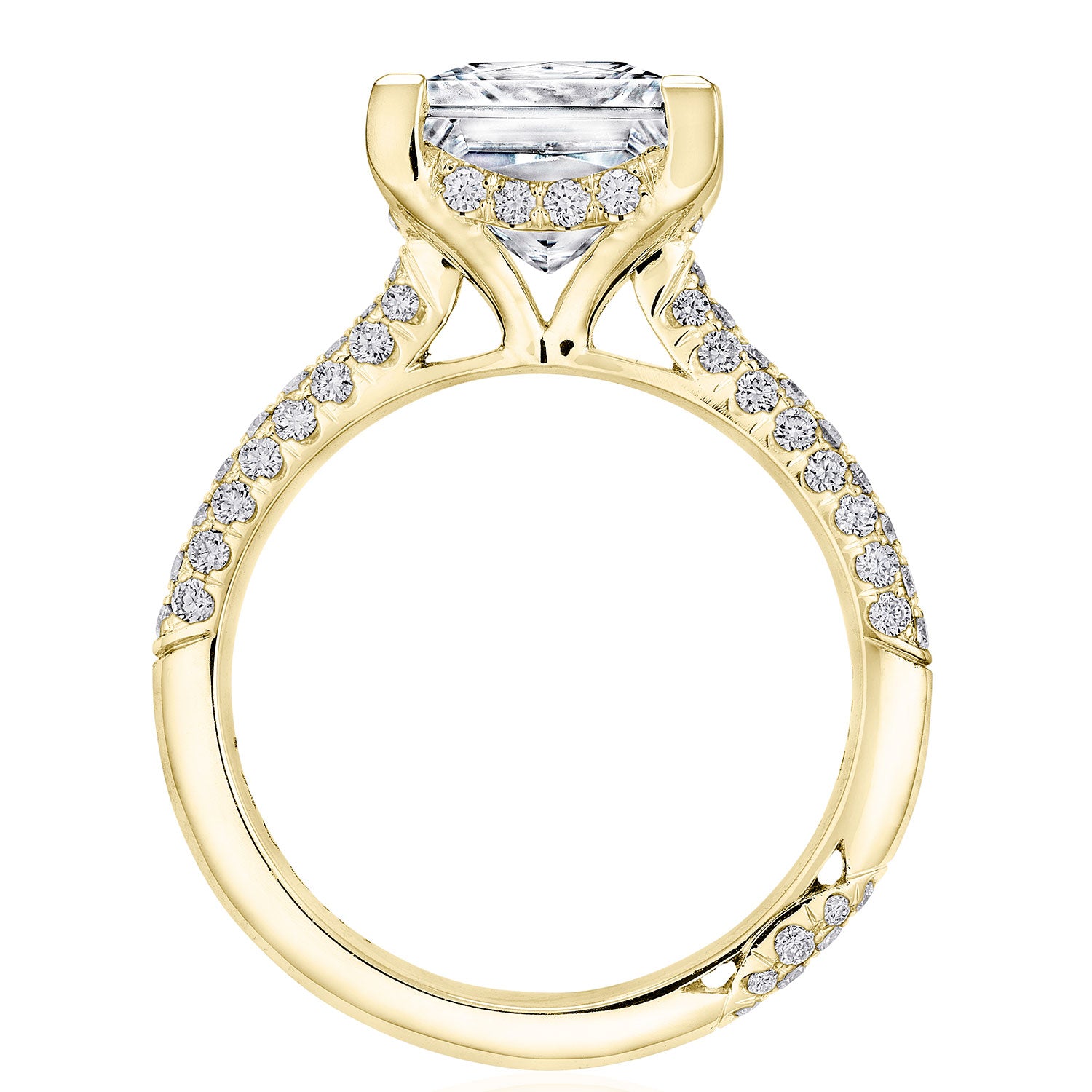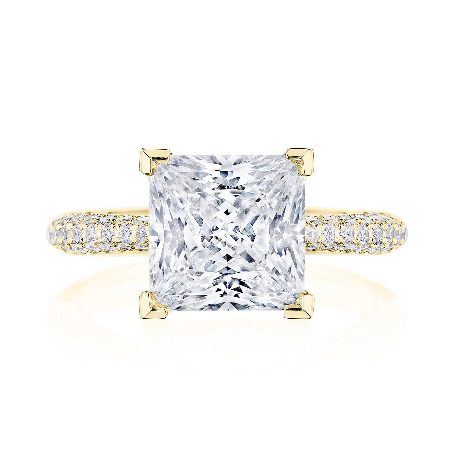 Designed by our Founder, Haig Tacorian, this stunning four-prong, solitaire engagement ring features a princess-cut center stone on a three-row pavé-set, diamond-intense band. Discover the hidden bloom of diamonds underneath the crown and the diamond-studded crescent signature at the foundation.